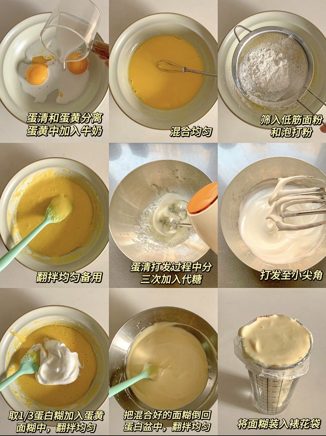 1. 拌蛋黄糊: 蛋清蛋黄分开装碗,蛋黄里倒牛奶搅散,筛入面粉和泡打粉(一定要筛!不然有面疙瘩),用刮刀翻拌到没有干粉就行,别使劲搅。