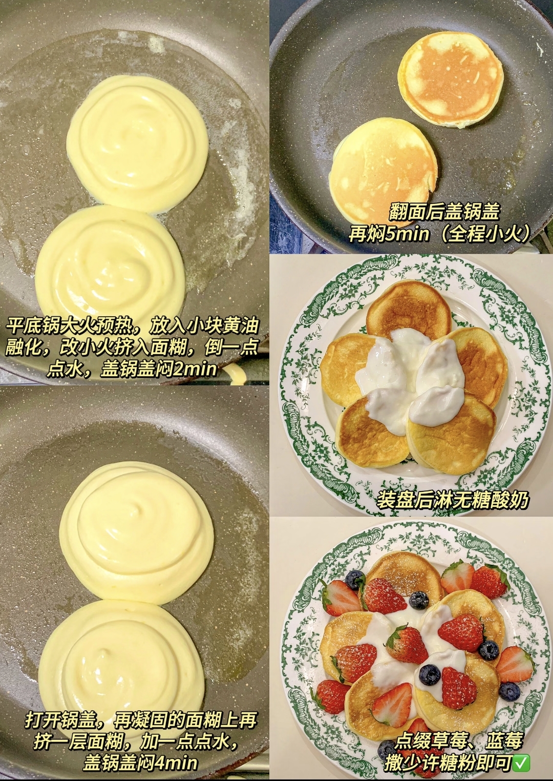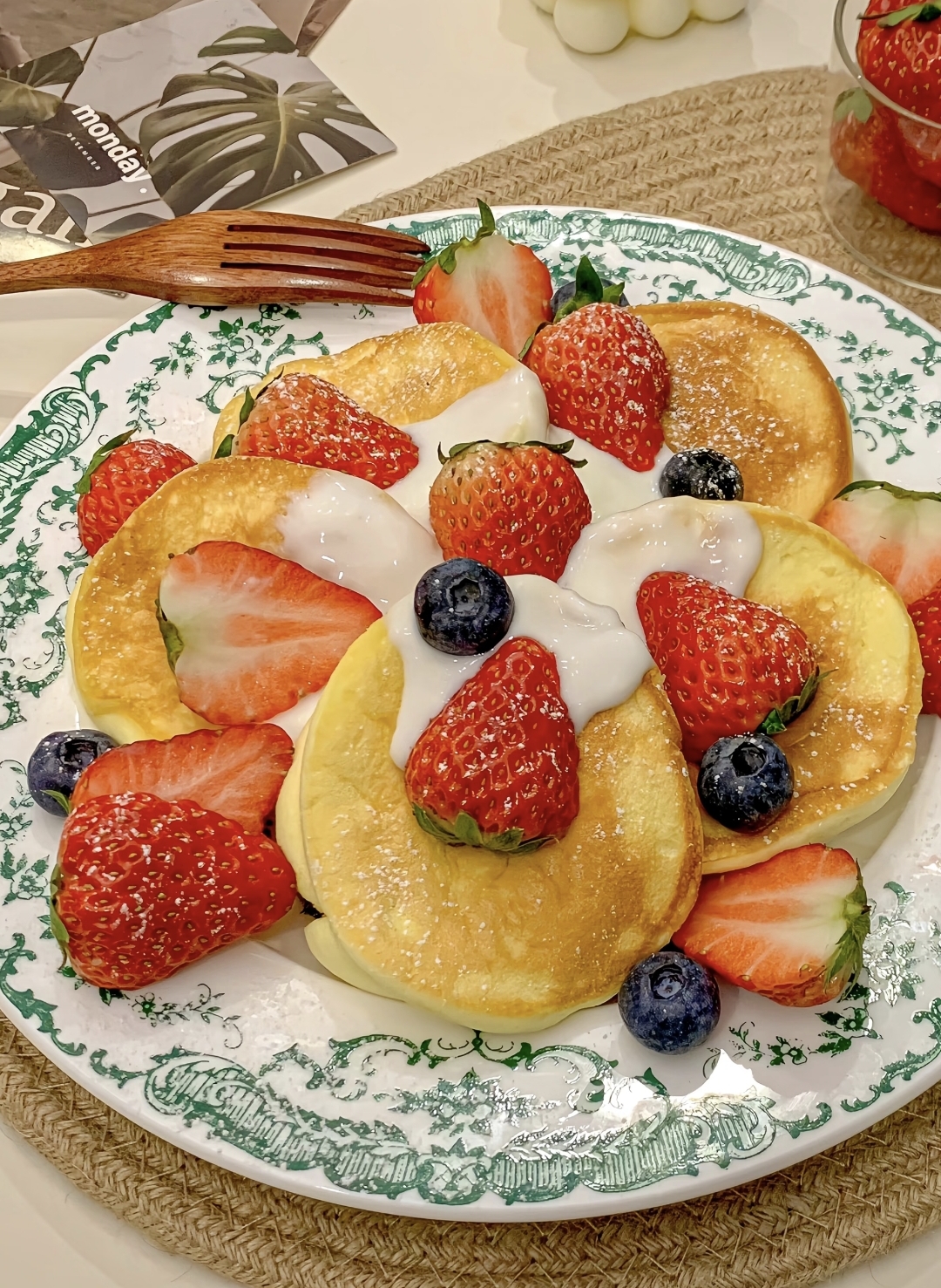 5. 炫就完事儿: 装盘后淋无糖酸奶,摆上洗好的莓果,撒点糖粉(减脂党可以不撒),用叉子戳开,里面像棉花一样软,咬一口全是奶香味,配着酸甜的草莓,直接给早餐封神!