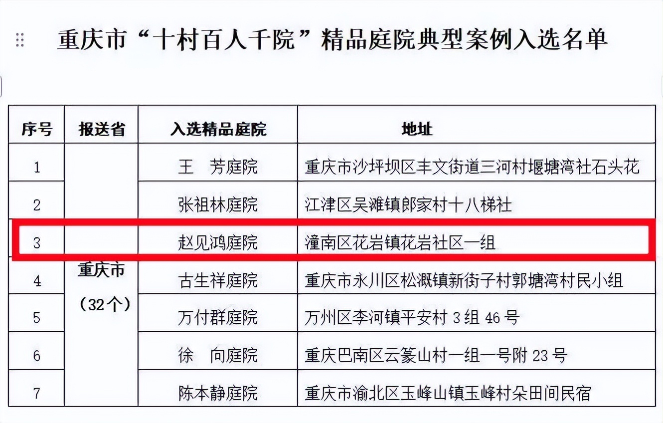 近日,全国妇联妇女发展部与中央广播电视总台农业农村节目中心联合发布并推介一批“十村百人千院”典型案例,其中:“美丽庭院”特色村典型案例10个,“美丽庭院”女主人典型案例100人,“美丽庭院”精品庭院典型案例1000户,其中潼南区选送的花岩镇花岩社区赵见鸿庭院获评全国精品庭院典型案例。