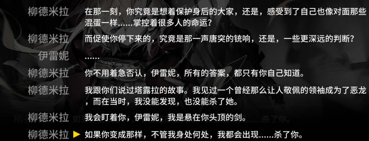 屠龙者终成恶龙,弑君者这个名字肯定是有深意的,只不过这个“君”会是谁我们暂且不得而知,有玩家猜测可能会是伊蕾妮,后者也是鲁珀族,新沃尔西尼卡车工会主席,相当年轻而有人望。我们细看一下卡车工会搞事情那张cg,伊蕾妮在前面呼喊,其实柳德米拉已经在后面随时准备出刀的感觉了。