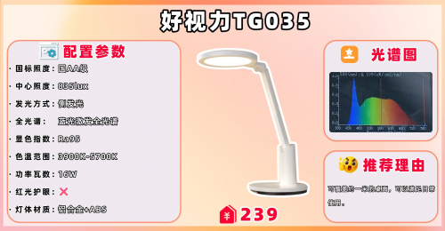 学生用的台灯哪个牌子好?好视力TG035护眼台灯外观为纯白色,设计比较简约。它采用直径14厘米的圆盘形发光面,光线能够覆盖一米左右的桌面区域。在功能方面,支持智能感光,可以自动根据环境光自动调整亮度;底座采用触控操作方式,支持三档色温与亮度调节。不过,从实际测试数据来看,蓝光峰值在1.0左右,数值偏高,长时间使用下需要注意用眼疲劳的问题。总的来说,它是一款功能基础、满足日常照明需求的台灯。