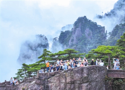 秋日的雨后,黄山风景区云海飘荡,奇松怪石在云雾中若隐若现,宛若仙境,吸引众多游客流连忘返。(施亚磊 赵美君 文/图)