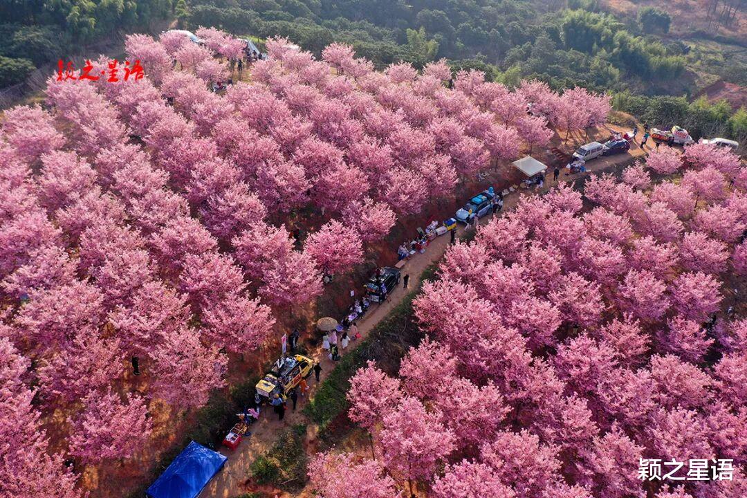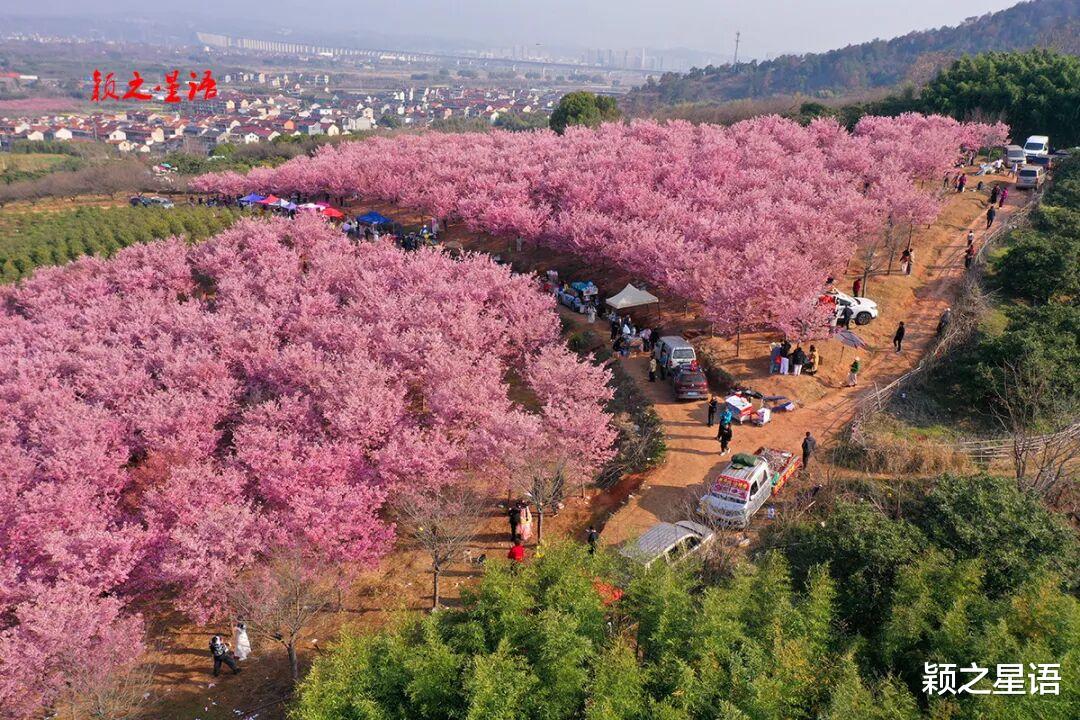 浙江省绍兴市嵊州市鹿山街道碧溪村,澄潭江畔,冷水孔山坡上的大片红粉佳人樱,正值最佳花期,远近游人蜂拥而至,名副其实的赏樱网红打卡地。