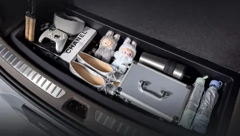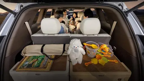 打开后备厢,按下隐藏按钮,51L暗格弹出,放进两个20寸行李箱,这个隐藏暗格太实用了,能放两个行李箱,外面再堆婴儿车、钓鱼包,后备厢还能保持整齐。以前出门像搬家,东西扔得满车都是,现在随手一放就归位,这车比家里还整齐。三代人出门,东西多到离谱。但N8L的49处储物,把“没处放”变成“随手放”——不用再跟老婆抢扶手箱,也不用让孩子把玩具抱在怀里,这才叫“省心”。
