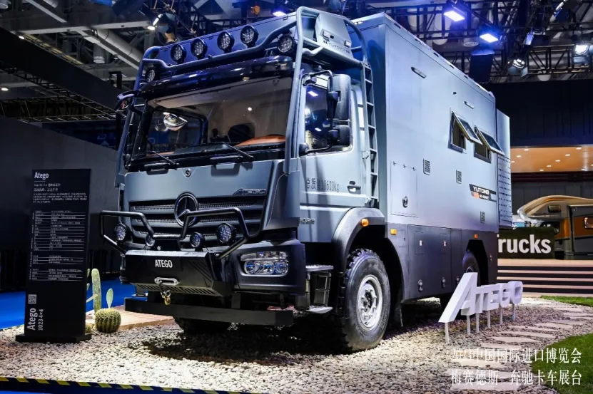 而近几年被大众所熟知的旅居车(房车)也在第六届进博会上大放异彩,尤其是基于梅赛德斯奔驰底盘打造的Atego 1023 4x4越野旅居车,在《第六届中国国际进口博览会传播影响力报告》第六届进博会展品传播热度TOP50中以25.48的热度位列第十五名,成为更多人热议的焦点。
