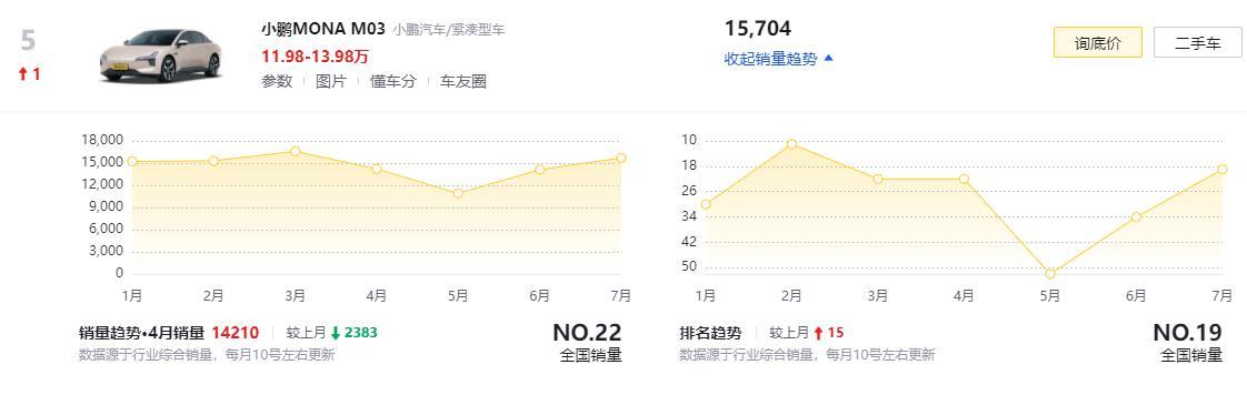 首先是小鹏MONA M03,作为紧凑级纯电轿车市场的新秀,从上市到现在,始终跑在同级车型的前面,而同时在7月份的销量榜当中,依然凭借15704台的数据领跑。不仅如此,本以为零跑B01的出现会影响到小鹏MONA M03的销量,但实际上比上个月还要多11593台。