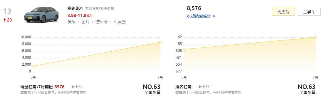 其次是零跑B01,作为人送外号“价格屠夫”的新能源汽车制造商,零跑B01这台车的价格十分感人,起步价仅有8.98万元。而从销量上看,零跑B01首月就已经交付了8576台,虽然跟小鹏MONA M03相差近一半,但按照这个趋势来看,零跑B01还是未来可期。