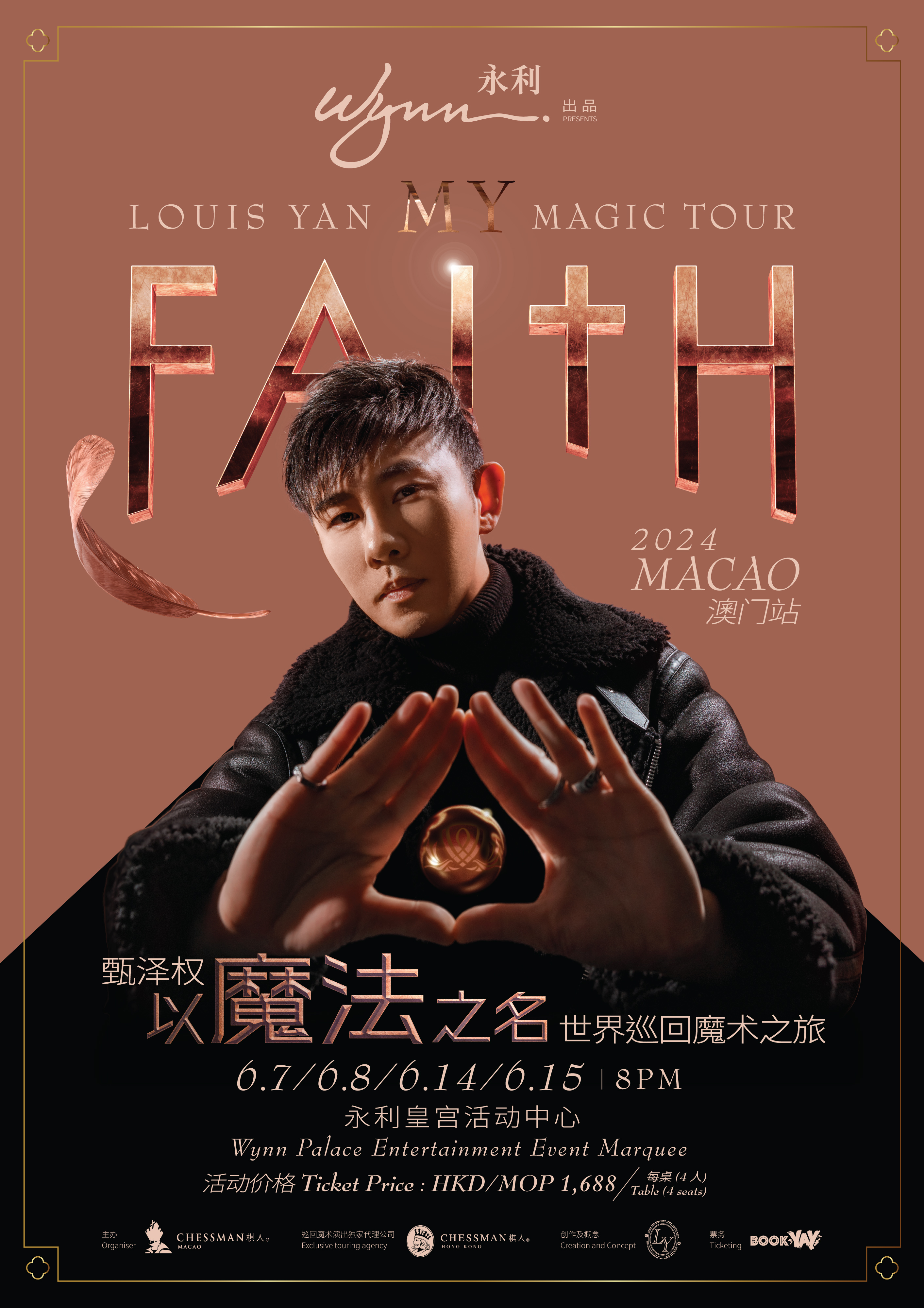 此次最新巡演以“MY FAITH”为主题,澳门为首站演出。对潜心钻研魔术技艺多年的Louis来说,魔术早已成为他的人生信仰,引领他走遍世界各地,成就一个又一个奇迹,让观众在转瞬顷刻间体验幕幕魔幻与惊奇。这次他将一如既往施展浑身解数,连续两星期于永利皇宫再现魔法奇迹,为观众送上新一番的奇妙体验。