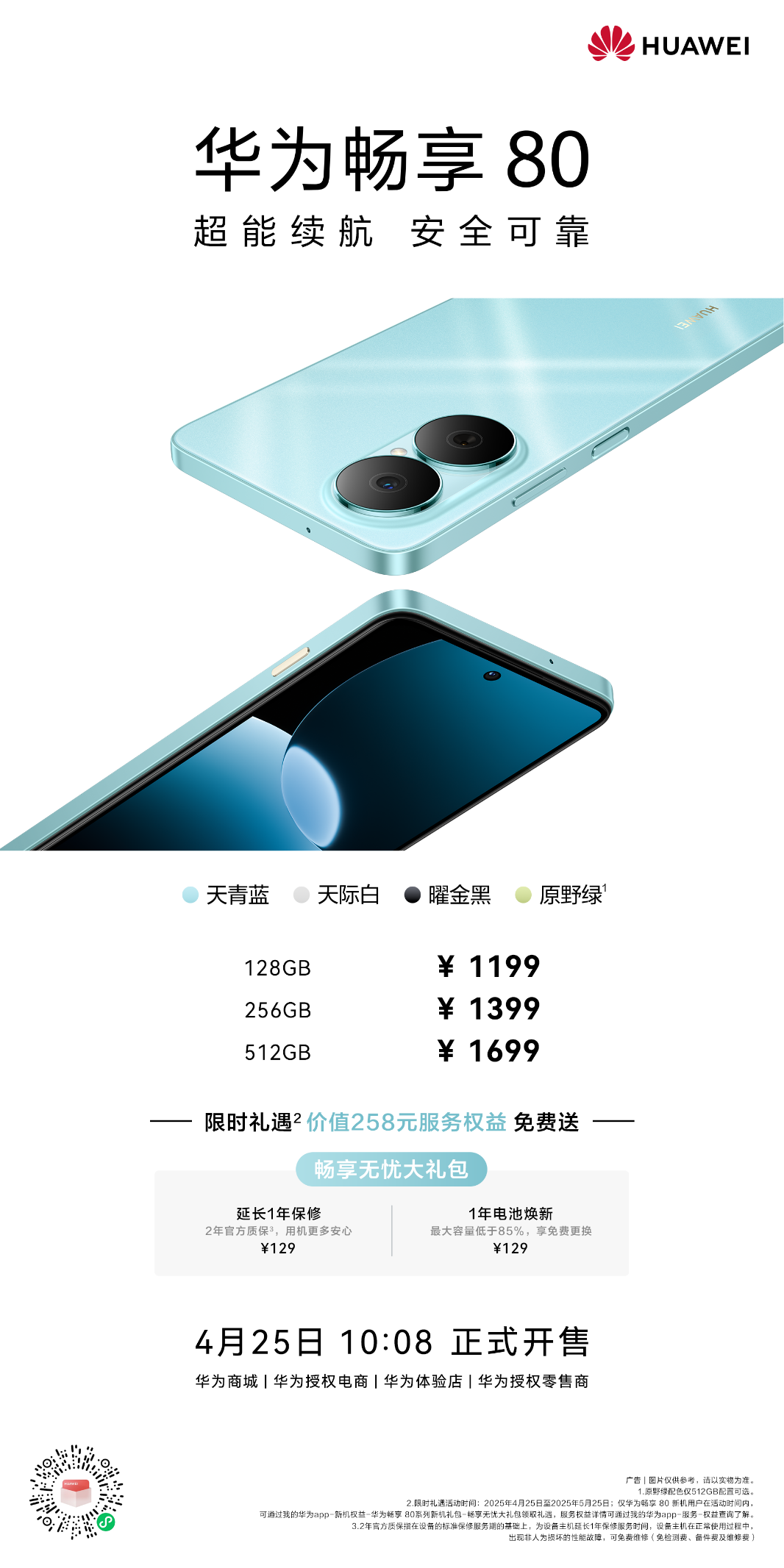 总的来说,华为畅享 80集前沿科技与人性化设计于一身,不仅颜值质感、功能配置全面升级,而且还拥有持久耐用的超能续航、安全可靠的鸿蒙系统和玄甲机身,完全对得起“超续航 超能扛”的市场定位。目前新机已全面开售,起售价1199元,国补最高直降254元,最低到手价1019元起。另外,2025年4月25日至2025年5月25日购买华为畅享 80的用户,还可通过我的华为app-新机权益-华为畅享 80新机礼包-畅享无忧大礼包领取专属礼遇。感兴趣的朋友,可登陆华为商城、各大授权电商平台下单,或前往华为体验店、华为授权零售门店进行购买。