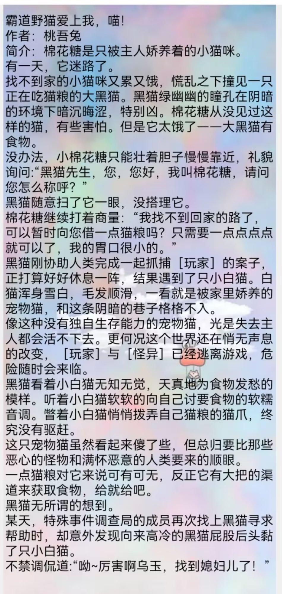 一、《霸道野猫爱上我,喵!》作者:桃吾兔文章字数:222607字(完结)文章类型:甜文 现代架空 萌宠二、《我想在妖局上