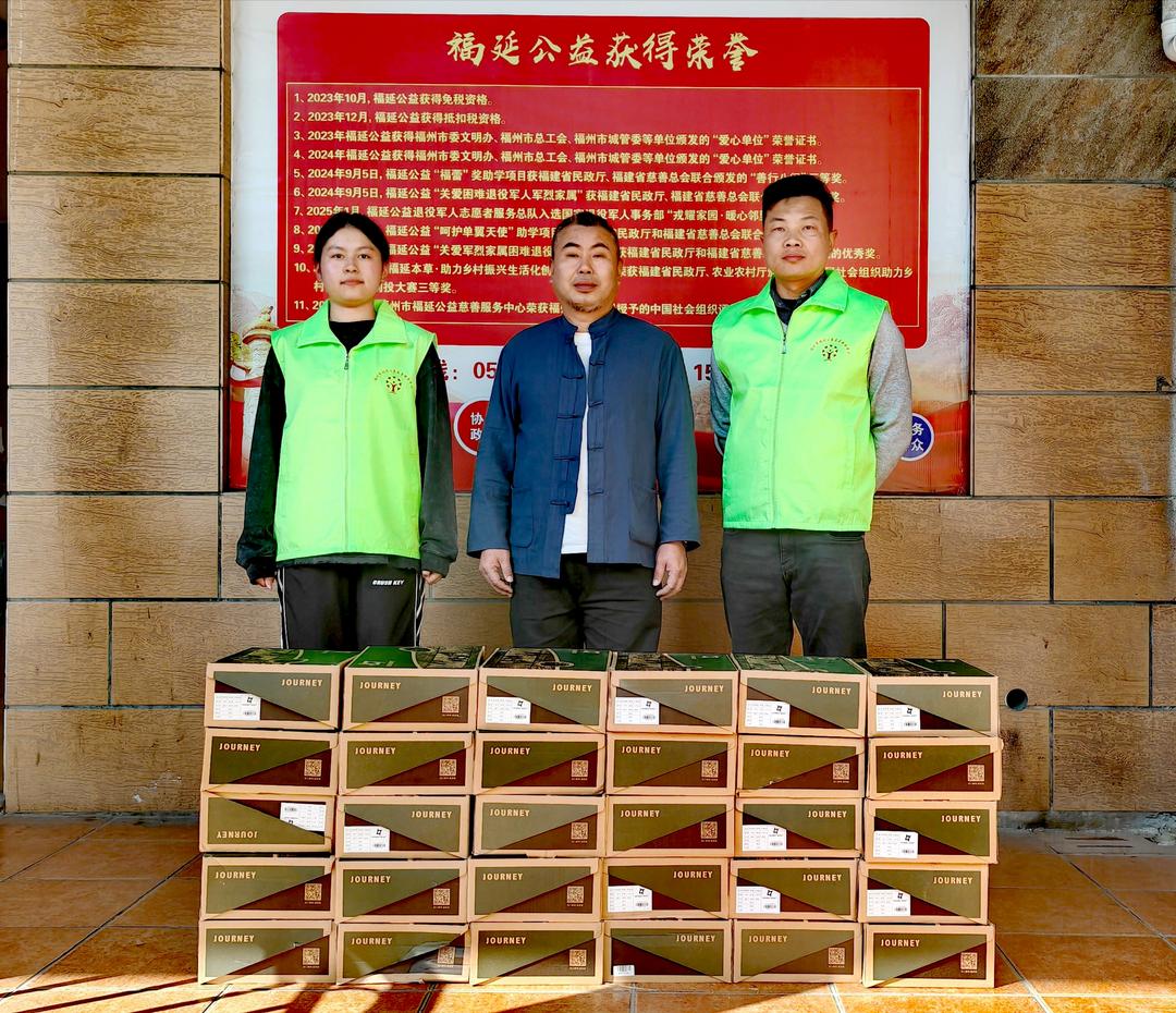 没有署名,没有联系方式,只有一句“向志愿者同志们致敬”的落款,却让在场的每一位福延公益人红了眼眶。他们想起无数个风雨兼程的日子:为独居困难老人上门捐赠时泥泞的小路,为困境儿童送去奖助学金和生活物资时崎岖的山路,为社区防疫值守时深夜的寒风……志愿者们的鞋子磨破了一双又一双,脚步却从未停歇,而这份来自千里之外的牵挂,恰好读懂了他们“踏破铁鞋也愿传递温暖”的执着。
