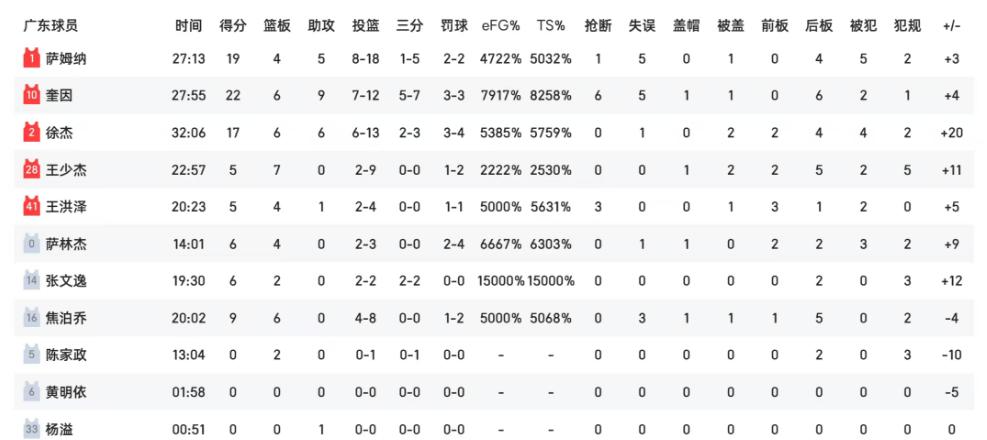 广东队:奎因22分6板9助6断、萨姆纳19分4板5助、徐杰17分6板6助、焦泊乔9分6板、萨林杰6分4板、张文逸6分2板、王少杰5分7板、王洪泽5分4板1助3断、陈家政2板、杨溢1助。