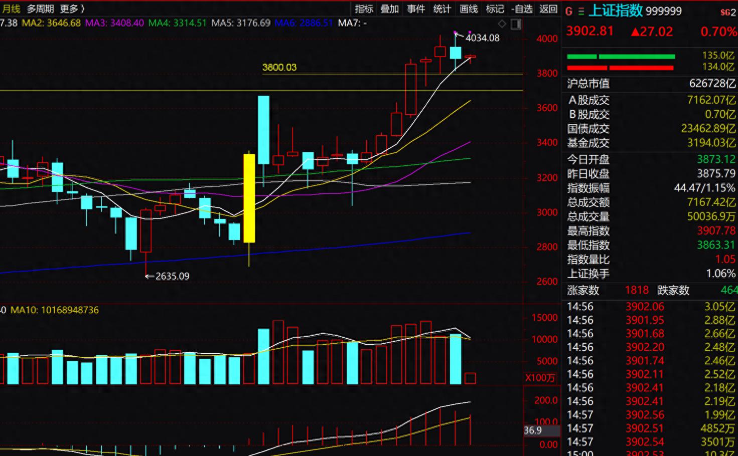 做下复盘解读:从上月底21号,大盘收出大阴线杀跌,随即第二天止跌到目前运行六天,按照神奇九转,刚好本周五。之前讲到牛市一般周五跌,熊市一般周五涨。理论上是需要注意风险的,日线上回补缺口在即,回补后调整的概率也比较大,月线上上证指数站在5日线上同时K线翻红,已经是非常强势。如果这个月能收出阳线(截止到31号月线收盘)下个月的大盘,或留给明年的空间相对来说更大一些,按照一年600到800点(暂定),和美博弈也留出了一年的时间,足够在科技上突围!