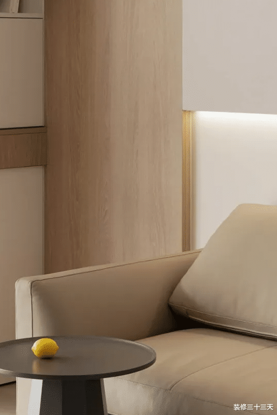 ▲ 沙发背景运用木饰面与浅灰色硬包结合,富有质感和层次