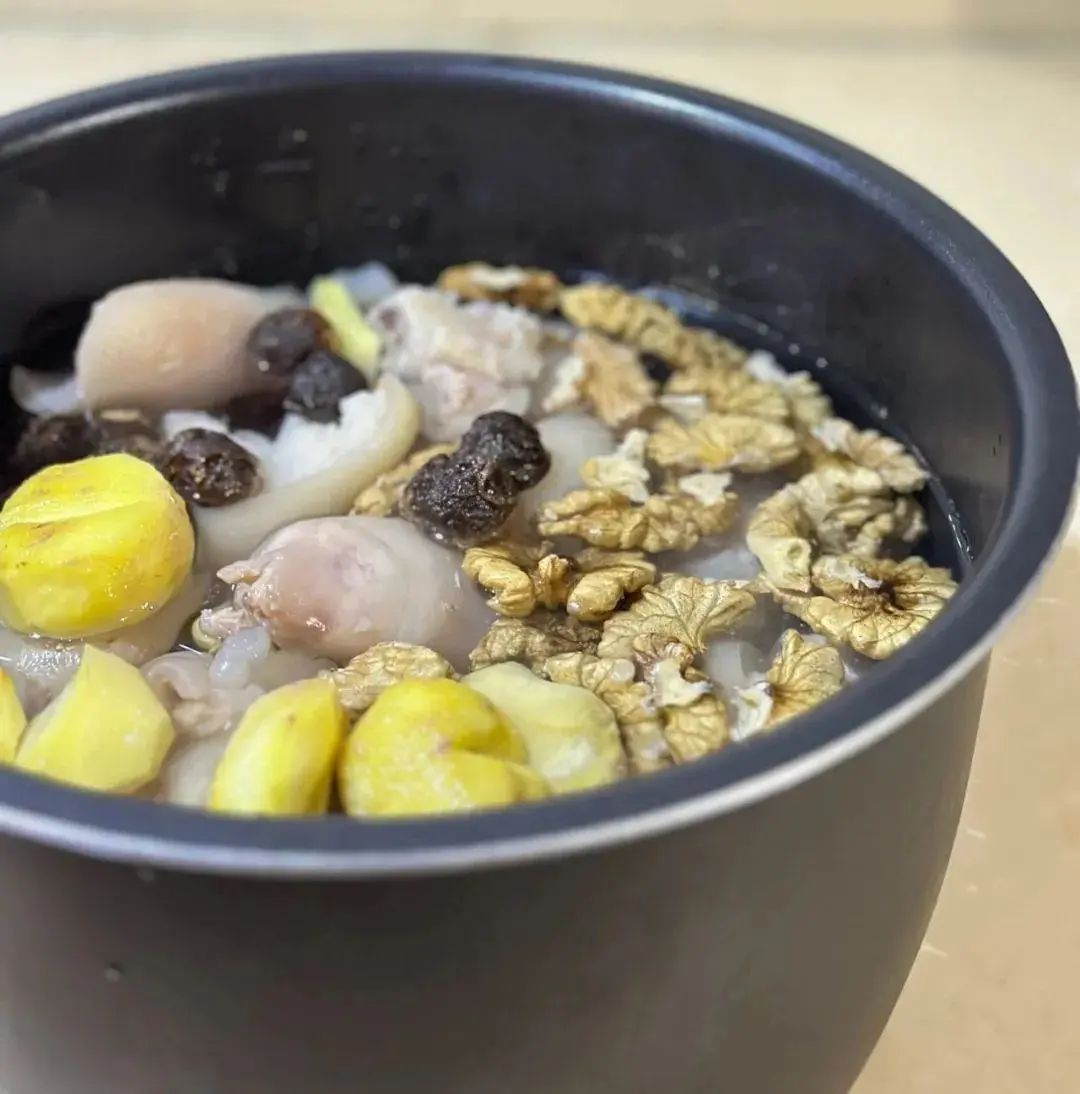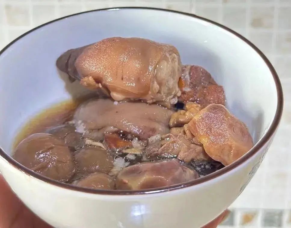 【科普】猪蹄中含有丰富的胶原蛋白,能延缓皮肤衰老,对于四肢疲乏、腿部抽筋、麻木者有一定辅助疗效;核桃仁具有润肺强肾、降低血脂,预防冠心病之功效;桂圆干具有益气补血,安神定志功效。板栗中含有丰富的蛋白质、碳水化合物等营养物质,可为身体提供能量,并帮助脂肪代谢,具有益气健脾、厚补肠胃的作用。几者结合食用可以健脾养胃、补肾强腰、强筋壮骨等。