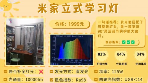 护眼大路灯哪个牌子好?米家立式学习灯是一款入门级的护眼大路灯,在智能功能上比较占优势,支持米家APP连接,还具备缓开缓灭、米家App智能连接等功能,另外,在光学设计上,米家采用全光谱灯珠,能够呈现Ra98左右的显色指数,色彩还原度高,于此同时,其发光面搭配了可旋转灯头,可90°独灵活调节照明角度,但需要注意的是,米家采用的是直发光方式,在实际体验中感光比较强,会有点轻微刺眼感。
