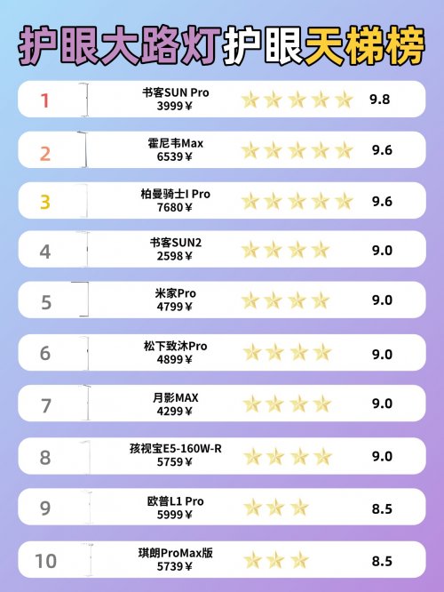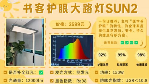 护眼大路灯哪个牌子好?市面上超过九成的大路灯都是采用了蓝光激发技术,这种蓝光激发机制从根本上决定了传统LED光源难以规避有害蓝光问题,相比之下,有着新材料实验室、眼科仪器硬件研发等专业技术实力的书客,采用了大幅度削减400~450nm蓝光峰值的第7代SunMaster紫光原芯,集合了「控·护·养」一体护眼硬核光学技术,从源头上对蓝光危害进行根除,使SUN Pro蓝光含量降低60%,减少94%的用眼视觉疲劳,是唯一做到性能最强且对眼睛损伤率最低的品牌!