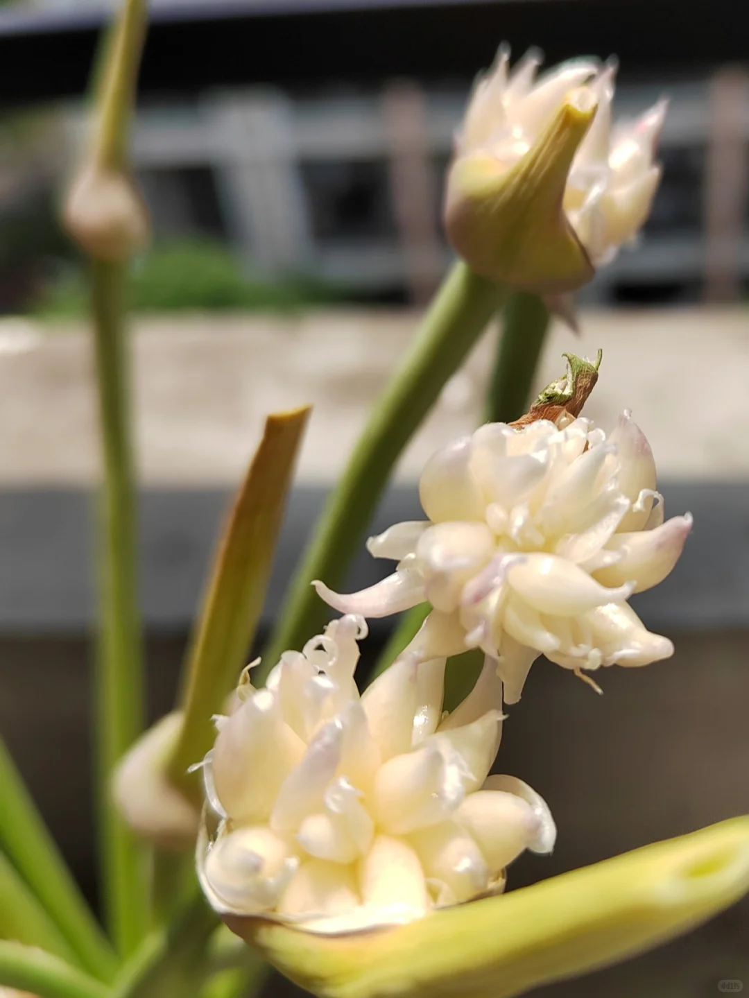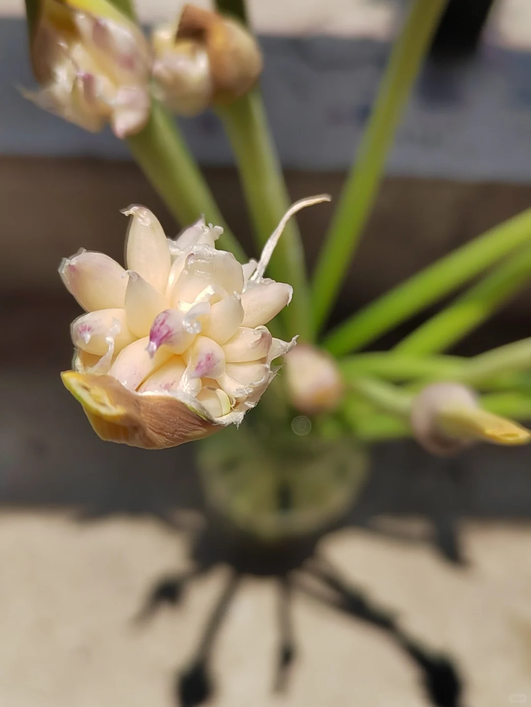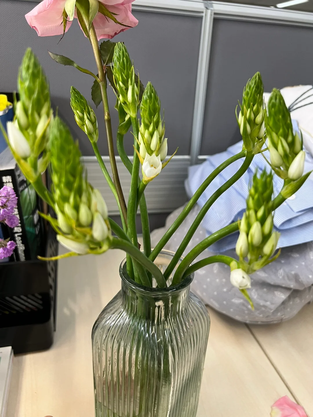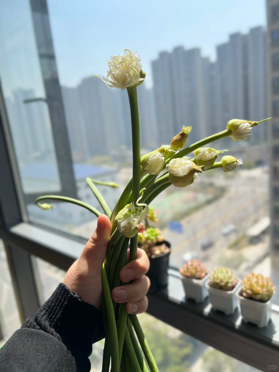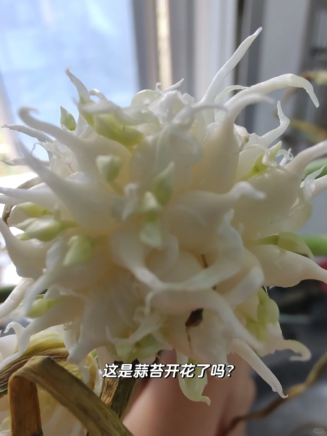 网友@称呼你分享到:蒜苔忘记吃,出差回来直接开花了!