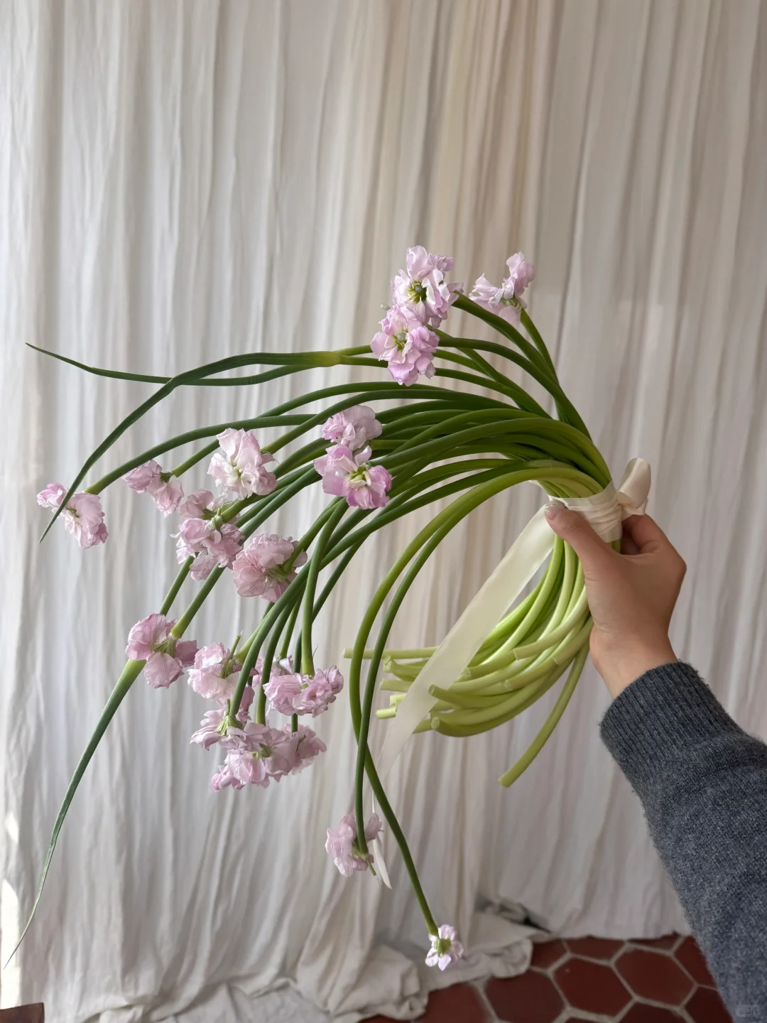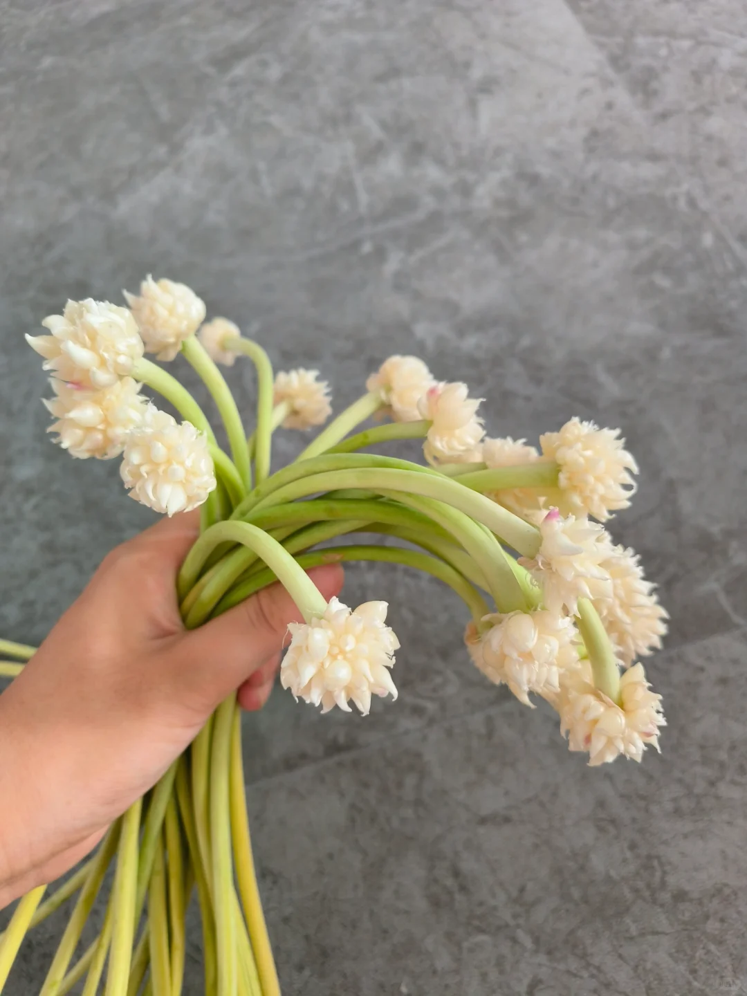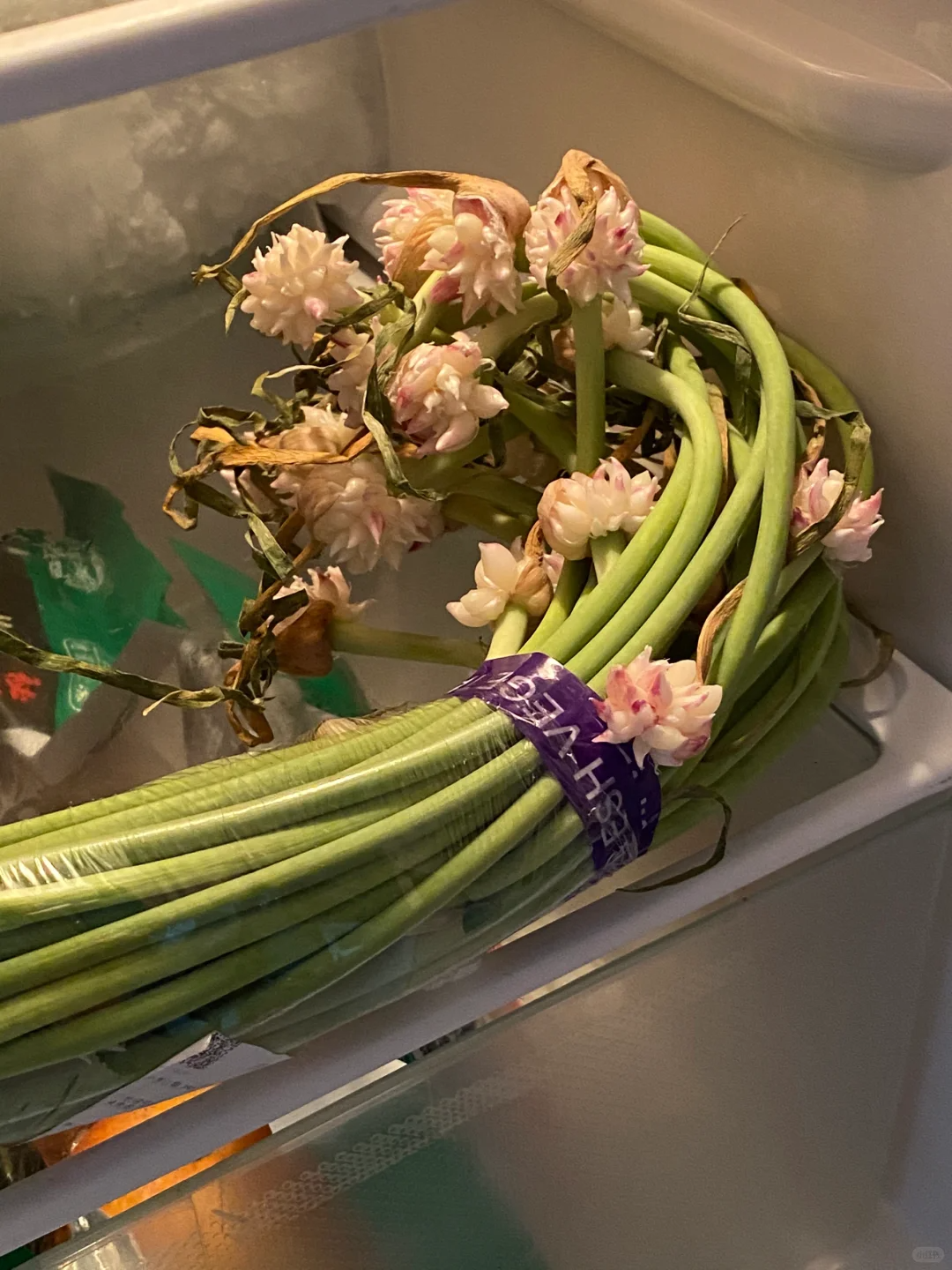那就是“放在冰箱里冷藏,防止变老的蒜苔居然开满了粉色的小花,一朵朵粉色的小花点缀在枝头上,宛如荷花一样精致。”