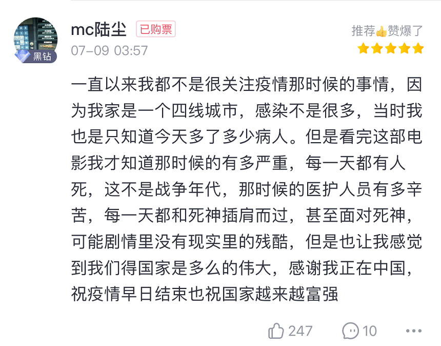 除却影片的故事精彩,有共鸣力度之外,电影还很专业,尤其是呈现出来的医疗救助细节,很受“专业”观众认可。