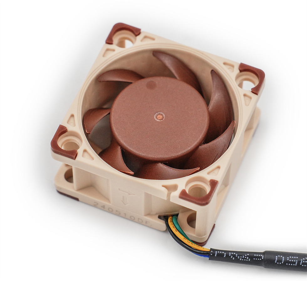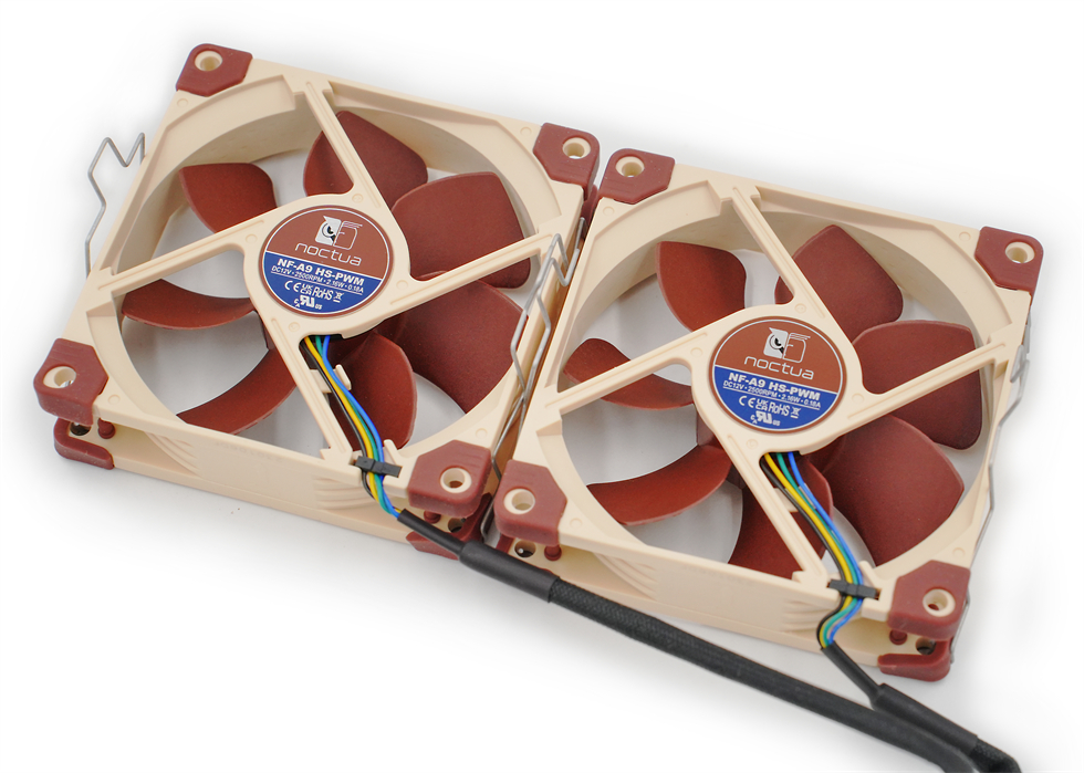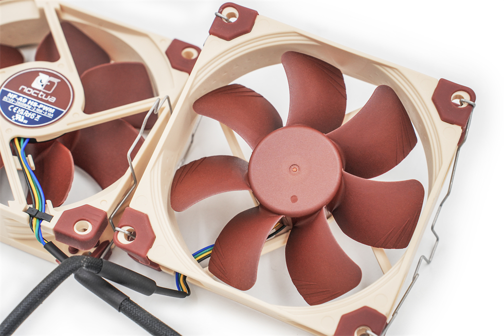 两个PWM调速控制的NF-A9 92mm风扇(2500转型号)特写来两张,风扇转数2500 RPM(±10%)-400 RPM(PWM,±20%)),噪音上限仅为30,6 dB(A)。