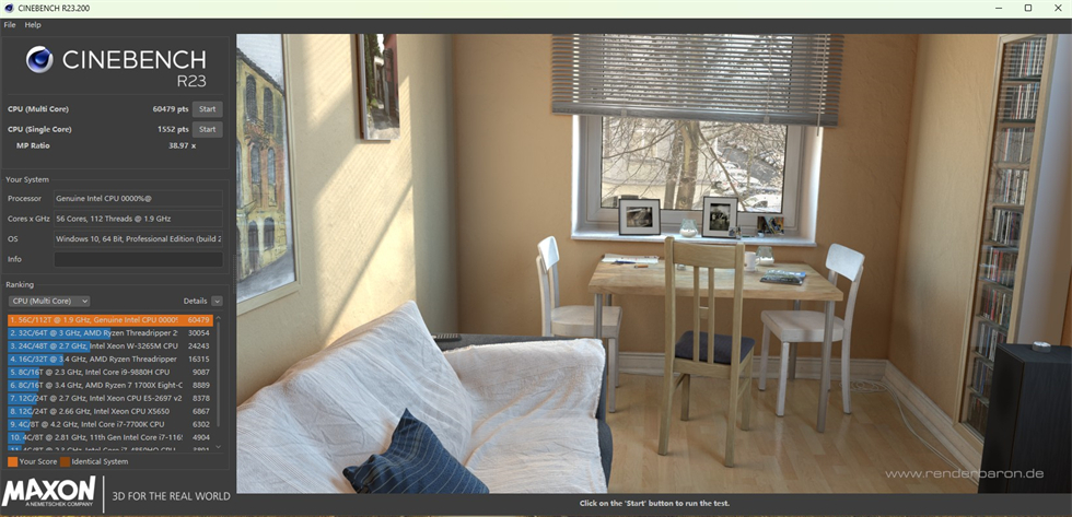 CINEBENCH R23测试:56核心,112线程,BIOS默认设置,单核1552pts,多核60479pts;