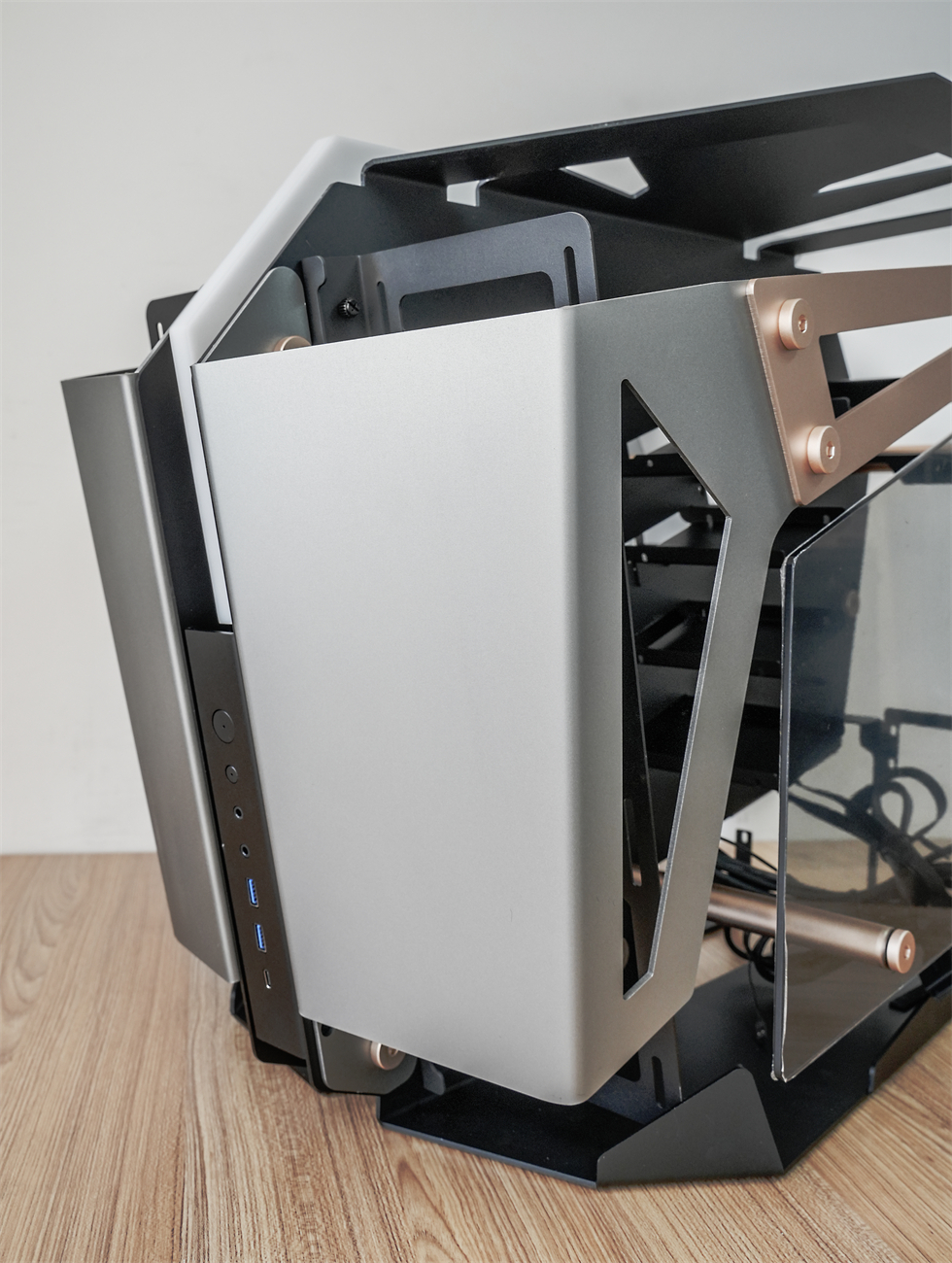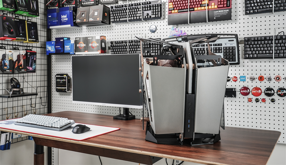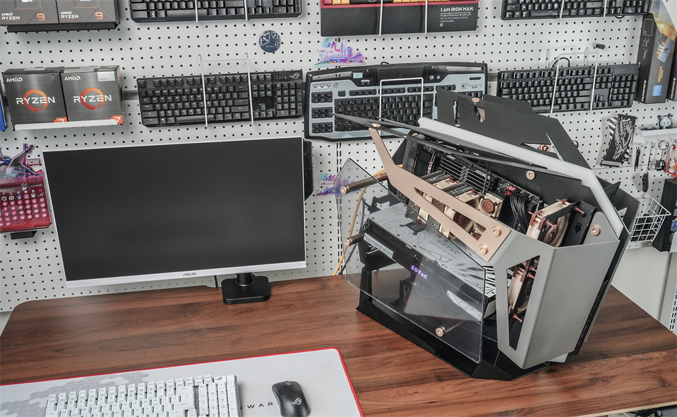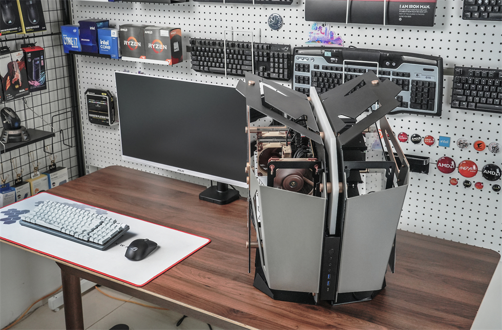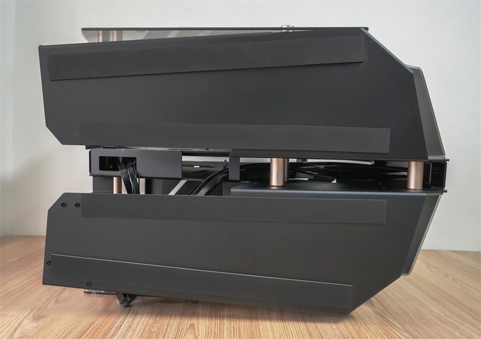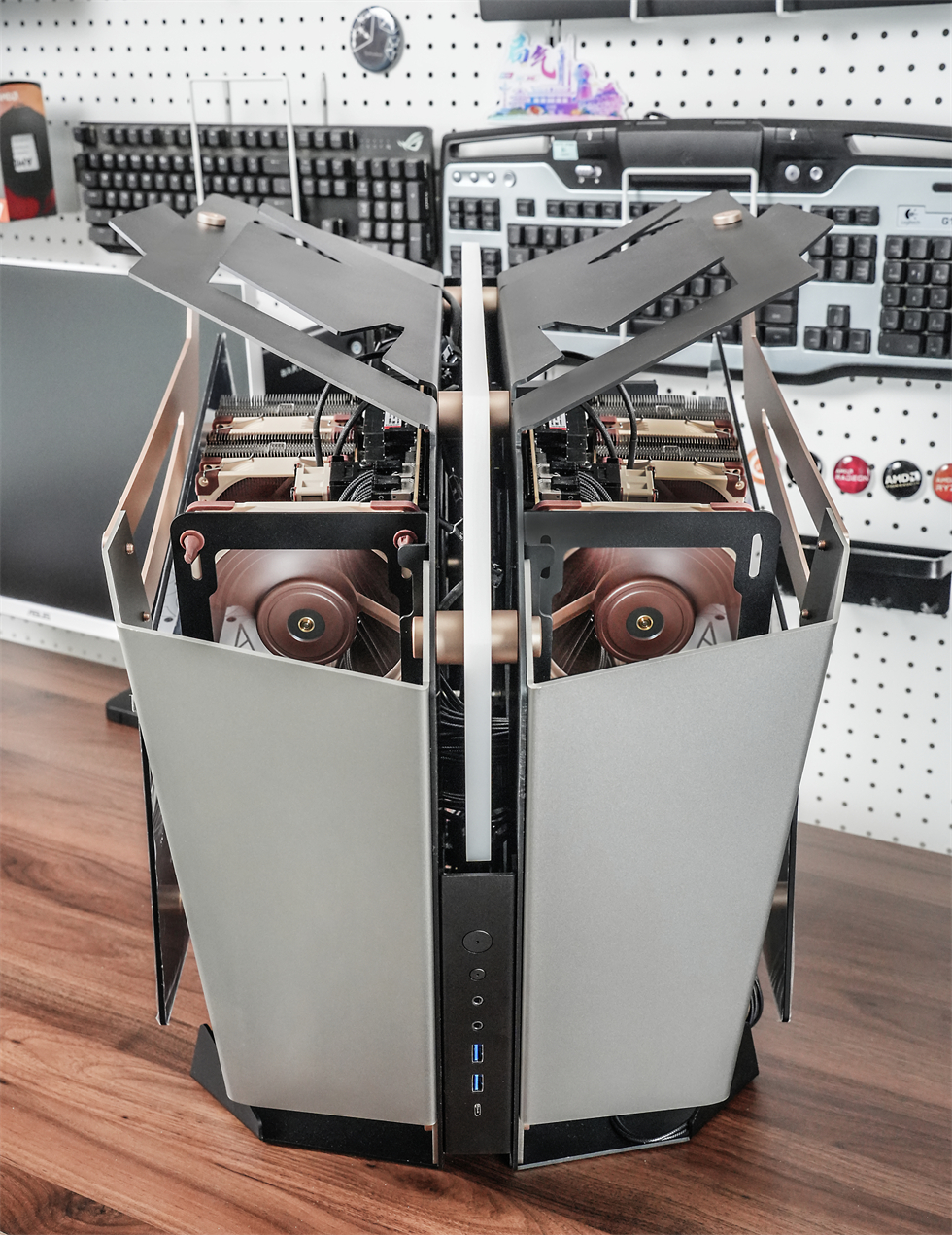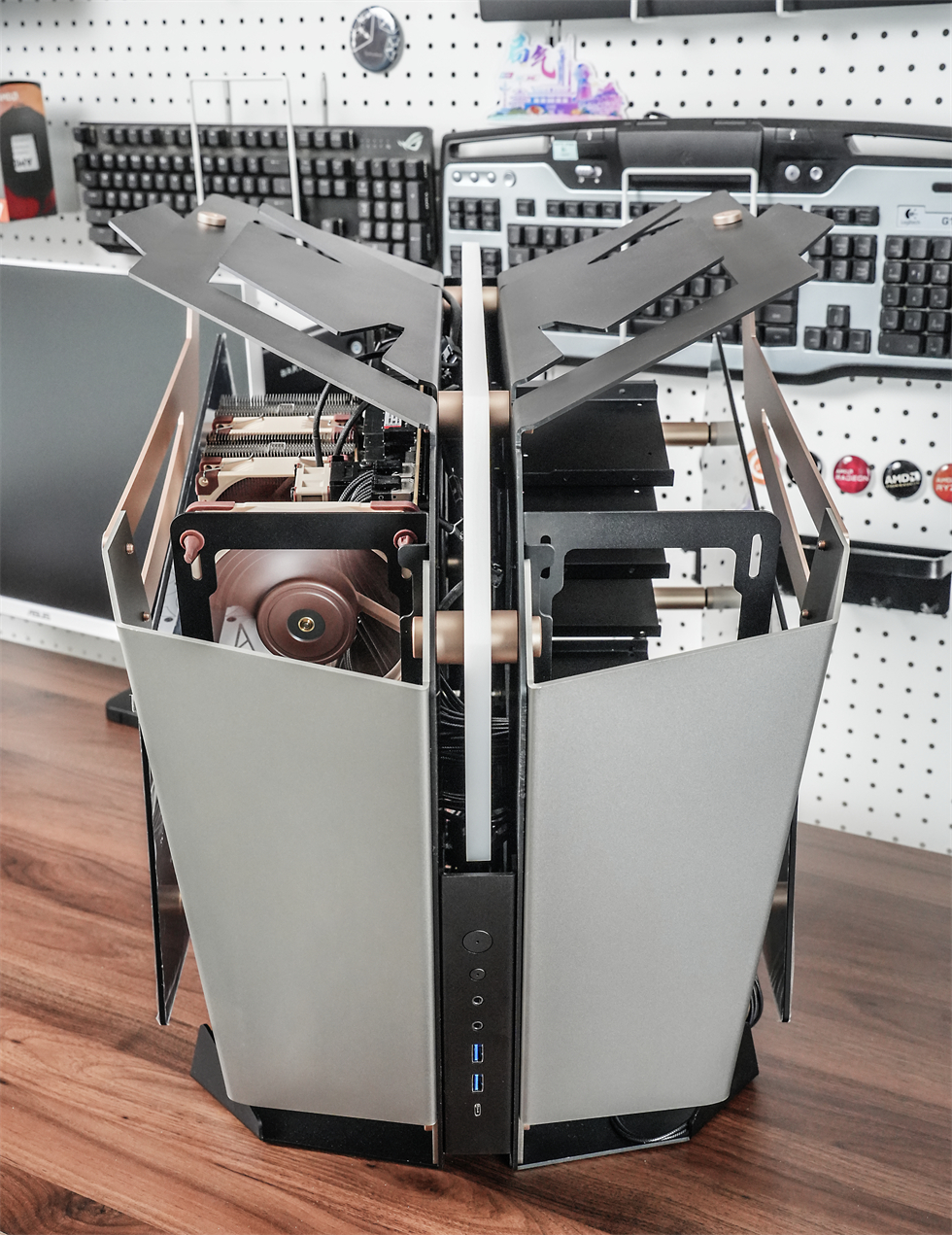 360°动图来一张,565×400×590mm的三围,属于开放式架构的异形机箱,采用了大面积折板处理的装甲一般的合金材质外壳,而且表面经过了喷砂处理,外观和手感都非常不错。