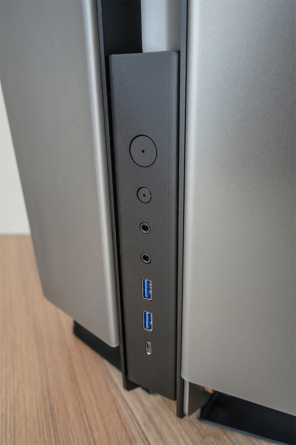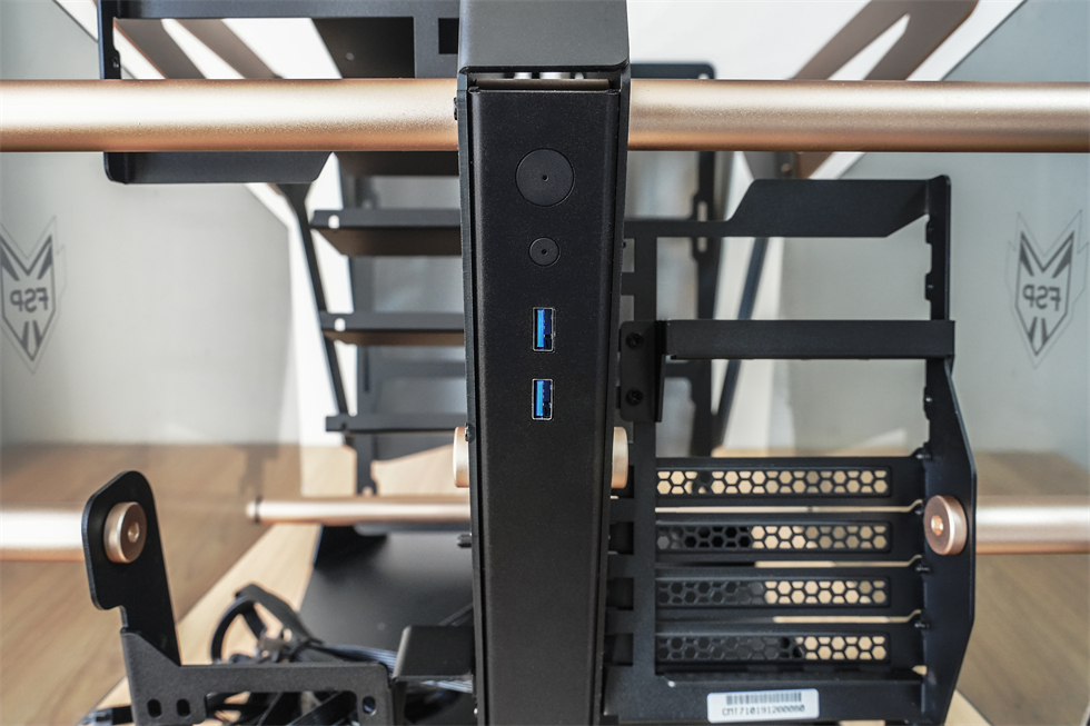 常规主机安装位的I/O区在主机的正面正中间,由上至下依次为电源开关、重启、耳机和麦克风接口、2×USB3.0 Type-A、1× USB3.0 Type-C。