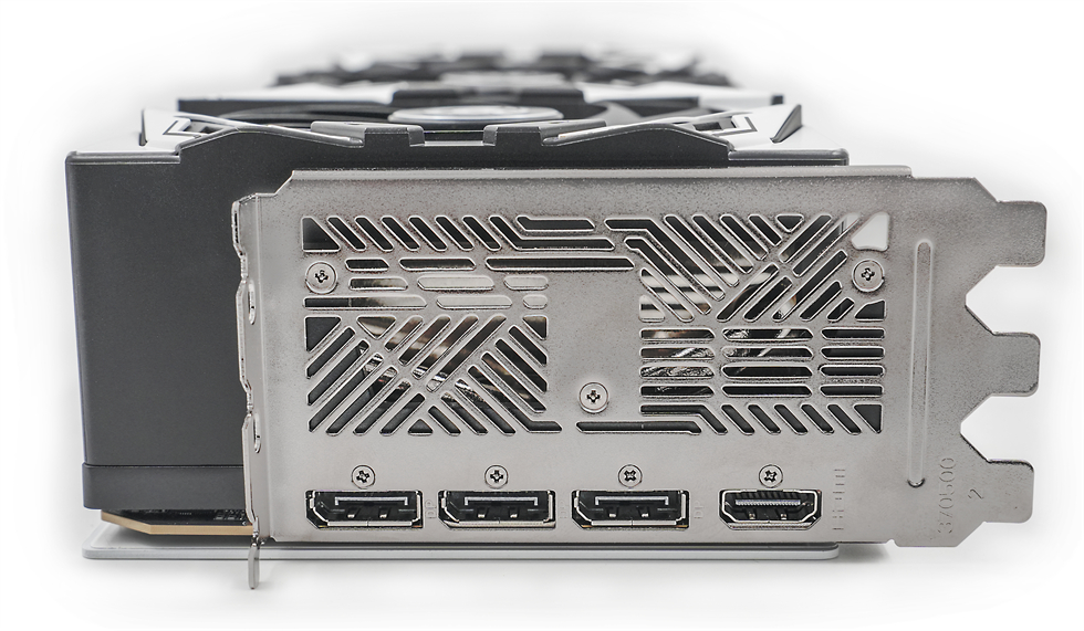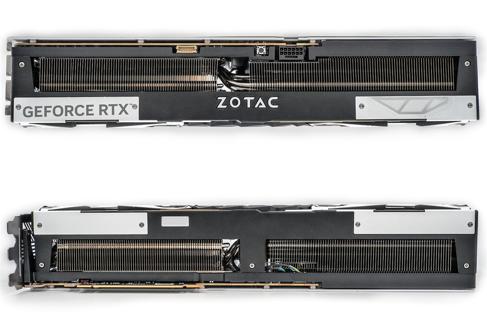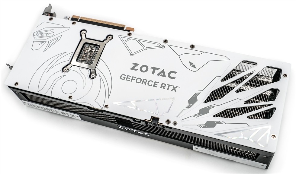 显卡背面覆盖合金背板已经是传统艺能了,背板底漆为白色,辅以“ZOTAC”的标志,颇为突出,右侧的大面积开孔构成了贯穿式风道,有利于空气穿透散热,进一步提升散热效能。