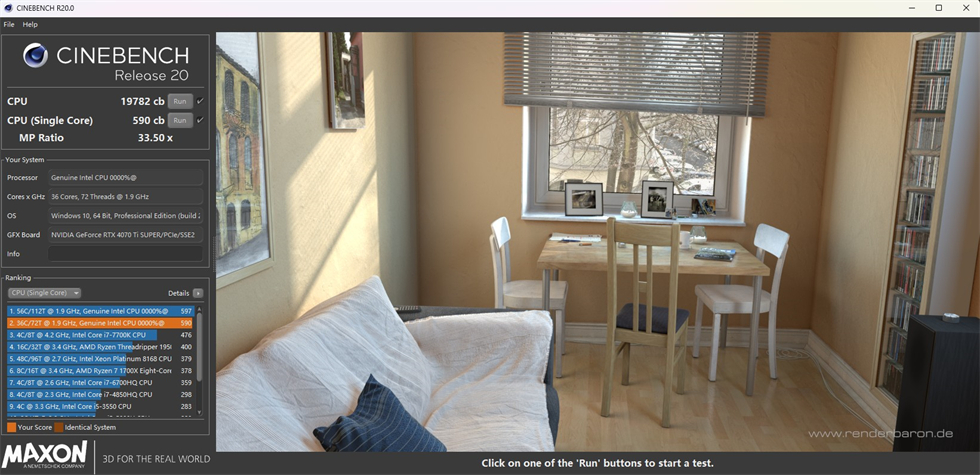 CINEBENCH R20测试:56核心关闭至36核心,BIOS默认设置,单核590cb,多核19782cb。