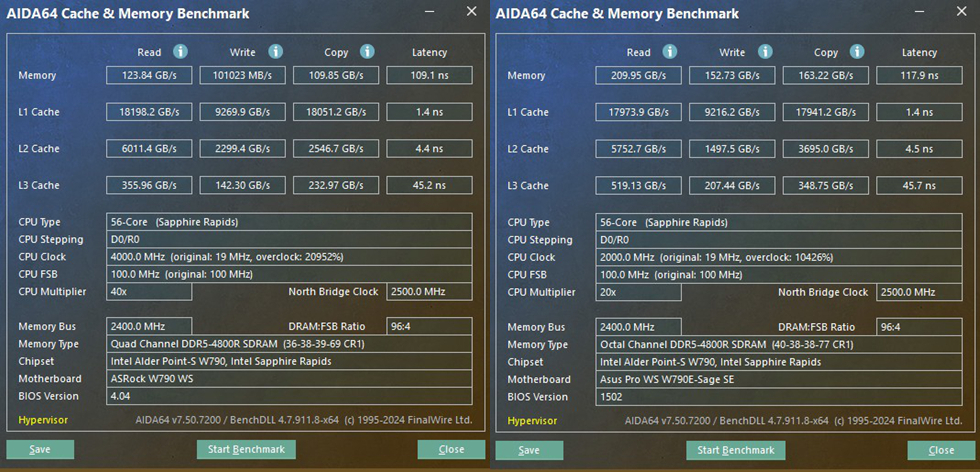 AIDA64 Cache&Memory Benchmark测试:开启4通道的时候是用华擎的那款W790测试的,4800MHz 36-38-39-69,内存带宽读取速度123.84GB/S、写入101023MB/S、复制109.85GB/S,延迟为109.1ns。开启8通道,4800MHz 40-38-38-77,内存带宽读取速度209.95GB/S(性能增幅69.53%)、写入152.73GB/S(性能增幅51.18%)、复制163.22GB/S(性能增幅48.58%),延迟为117.9ns。