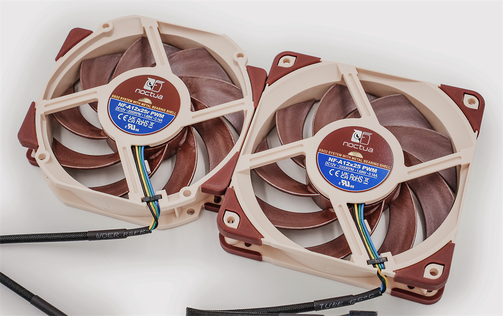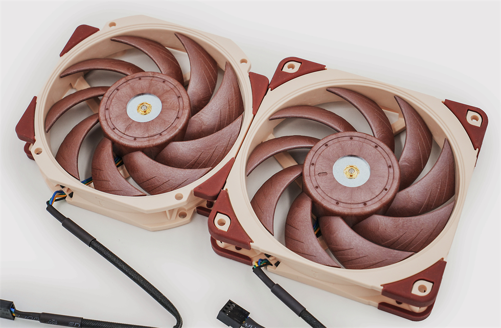 NF-A12x25 PWM和NF-A12x25r PWM合照来两张,两个风扇都是120mm的标准尺寸,只有外框形状区别。