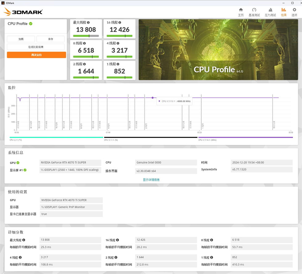 3DMARK CPU Profile也玩一下试试水:56核心关闭至36核心,BIOS默认设置,1线程852,2线程1644,4线程3217,8线程6518,16线程12426,最大线程13808。