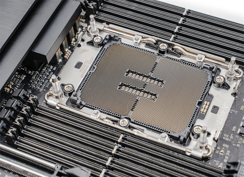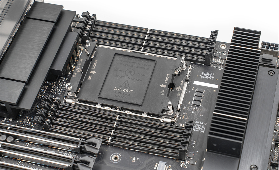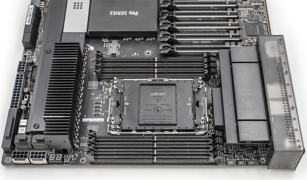 W790E-SAGE是一块拥有EEB身段的主板,30.5cm x 33cm的巨大体型,VRM散热片也同样巨大,右侧的供电模组上有采用高长宽比的切削式薄型鳍片,以提高热效率,如果想要CPU跑稳超频,那就需要在其上通过风扇支架安装三个40mm风扇,7个PCIe 5.0 x16插槽均采用SafeSlot高强度金属强化设计,8个内存插槽,最高支持6800(OC)频率,高达2TB的ECC R-DIMM DDR5内存。三个M.2插槽,两个支持PCIe 5.0 × 4的在右侧的长条状散热装甲下,一个支持PCIe 4.0 × 4。