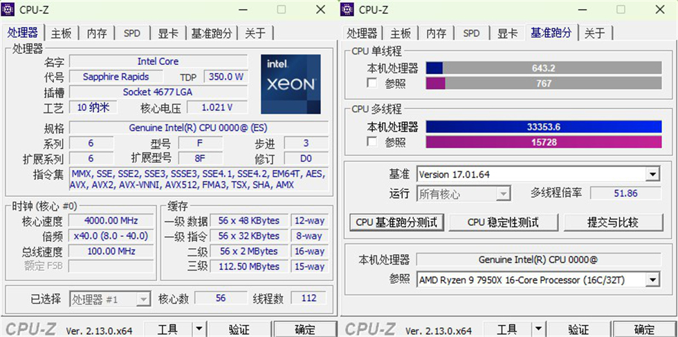 8480+的ES,CPU-Z显示0000ES,默频1.9GHz,睿频4.0GHz,全核满载3.0GHz,56核心,112线程,350W的TDP。不过相对于当年9980和10980一系HEDT,这一代算得上昙花了。