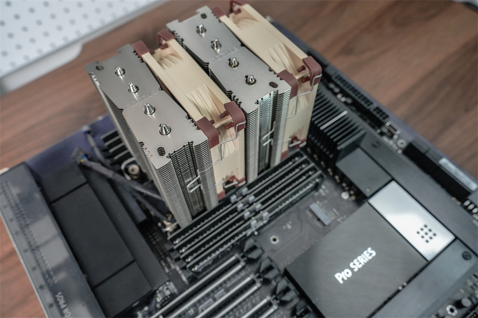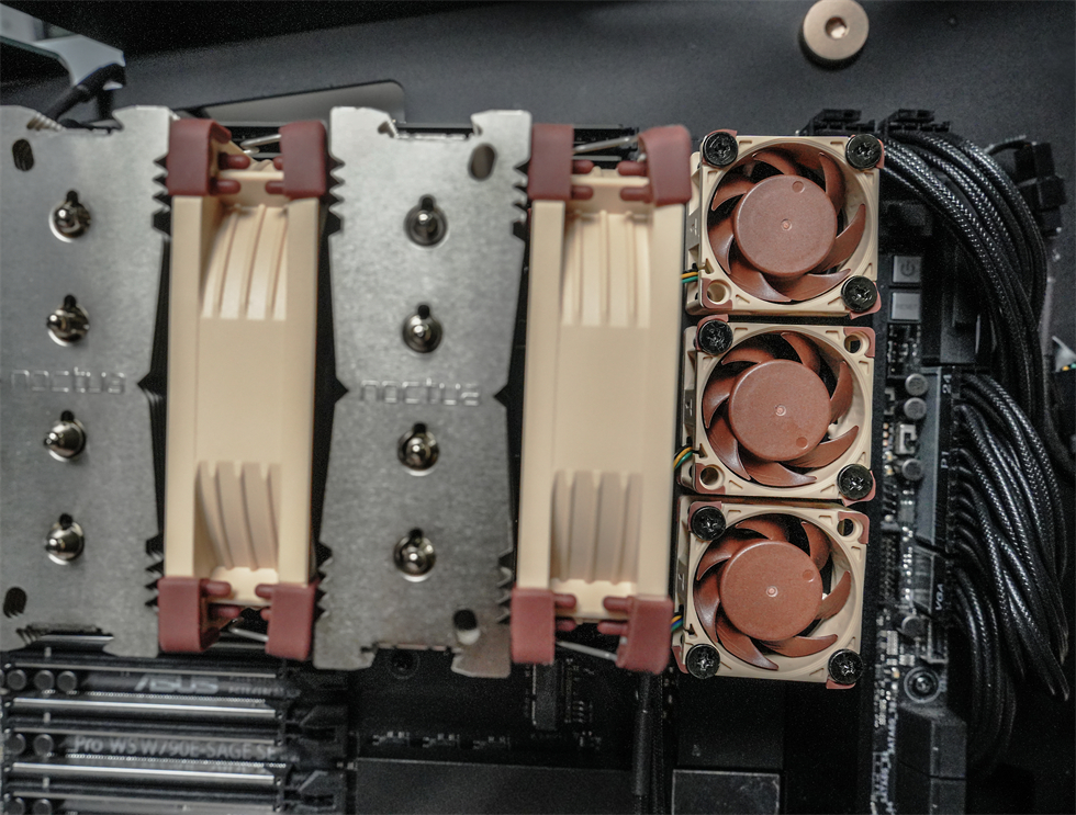 因为华硕的Pro WS W790E-SAGE SE主板供电不增加3×40mm的三风扇主动散热,CPU的稳定运行功耗上限将下降至600W,限制性能释放,所以还入了猫头鹰的NF-A4×20。