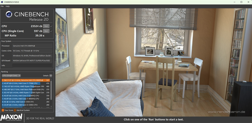 CINEBENCH R20测试:56核心,112线程,BIOS默认设置,单核597cb,多核23524cb。