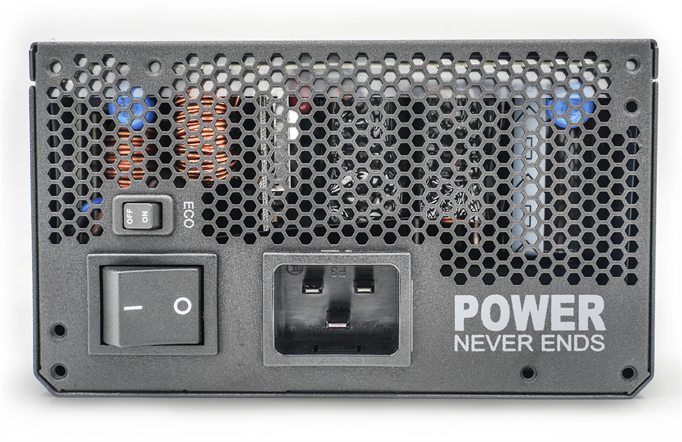 ECO开关可以使电源在负载降至40%以下的时候启动零转速模式,起到静音和冷却性能的平衡,从这个角度能依稀看到官方介绍里提及的105℃日系电容, 以及各种巨大的电气元件,提供了官方介绍里包括过电压保护,过电流保护,过载保护,短路保护、过温保护,低电压保护等多重防护。