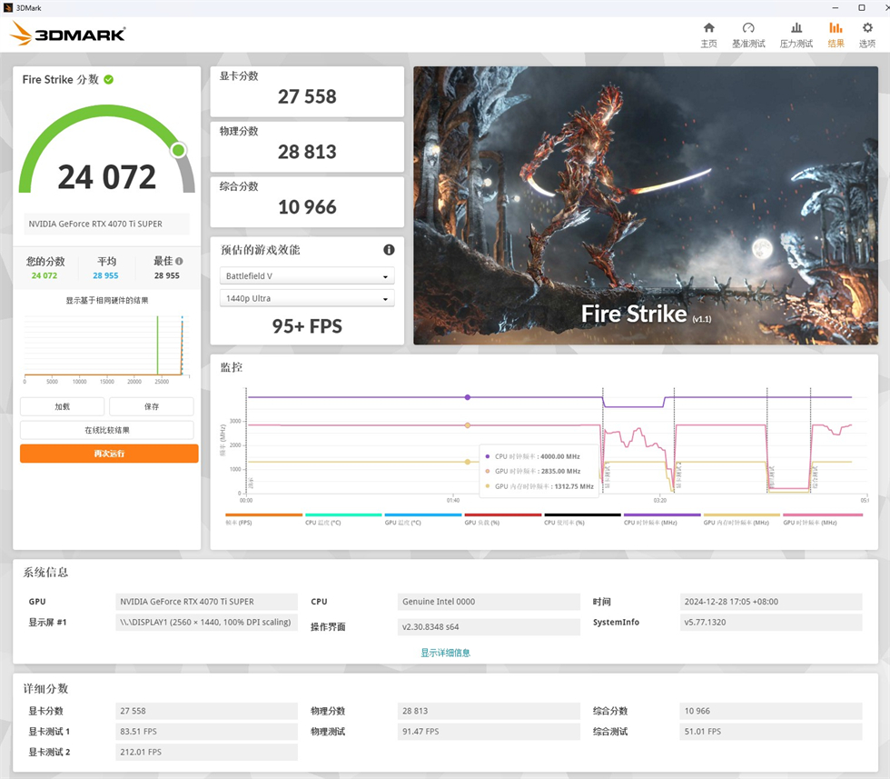 3DMark Fire Strike测试:56核心,112线程,BIOS默认设置,总分24072,显卡分数27558,物理分数28813,综合分数10966。