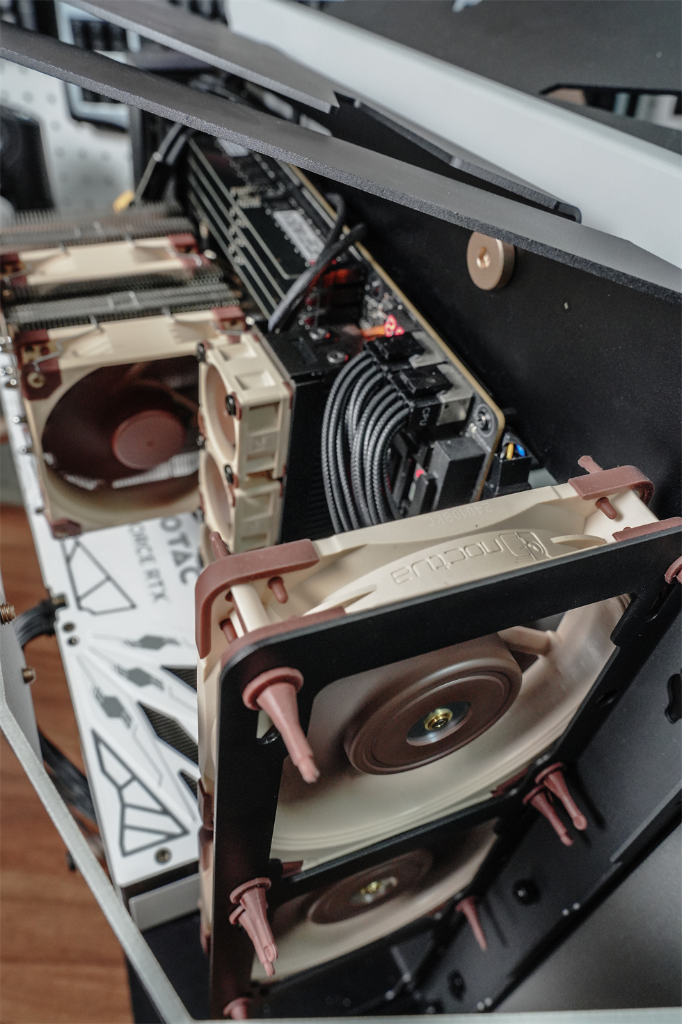 我之前从其他大佬的测试中得知若W790E-SAGE的供电不增加3×40mm的三风扇主动散热,CPU的稳定运行功耗上限将下降至600W,限制性能释放,所以用W790E-SAGE自带的3×40mm风扇固定架加装了猫头鹰的NF-A4×20。