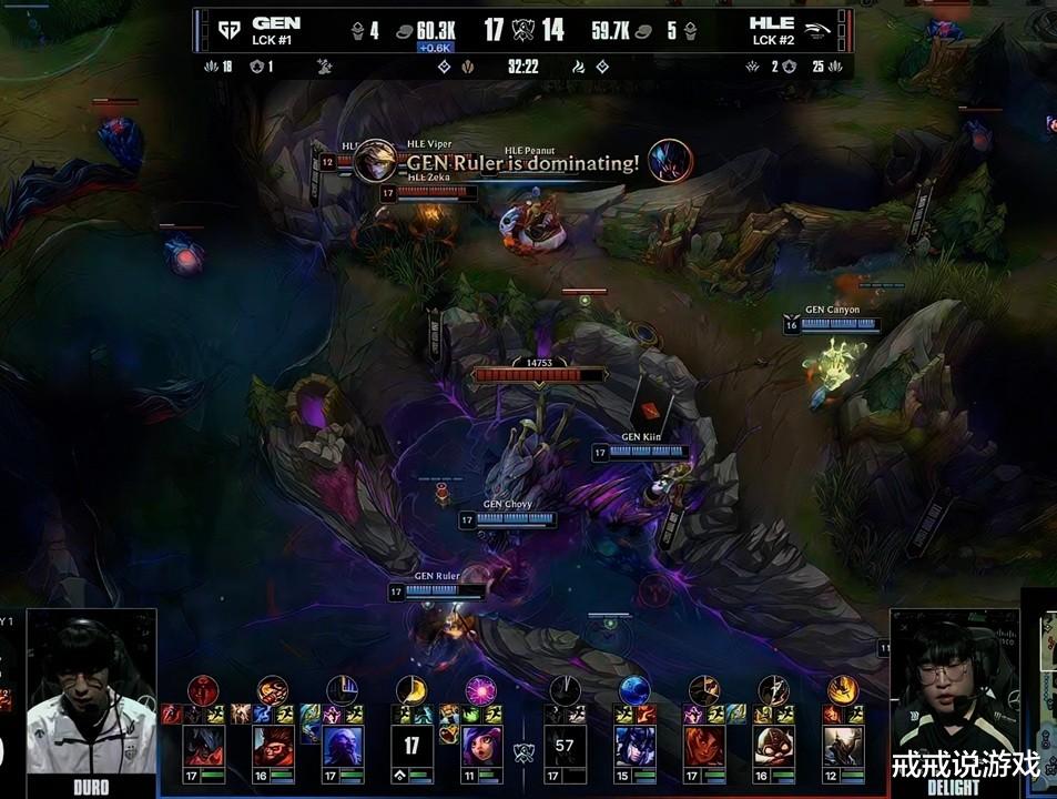 第一局比赛,GEN从BP开始就展现出了充分的准备。他们选出了一套中后期团战极强的阵容,而HLE则试图通过前期节奏打开局面。比赛刚开始,HLE打野就频繁针对上路,成功帮助Zeus拿到一血。但GEN丝毫不乱,通过精准的视野控制和资源交换慢慢扳回劣势。Chovy的沙皇在中期团战中发挥出色,几次漂亮的禁军之墙都成功分割了HLE的阵型。最关键的一波发生在第22分钟的大龙团。
