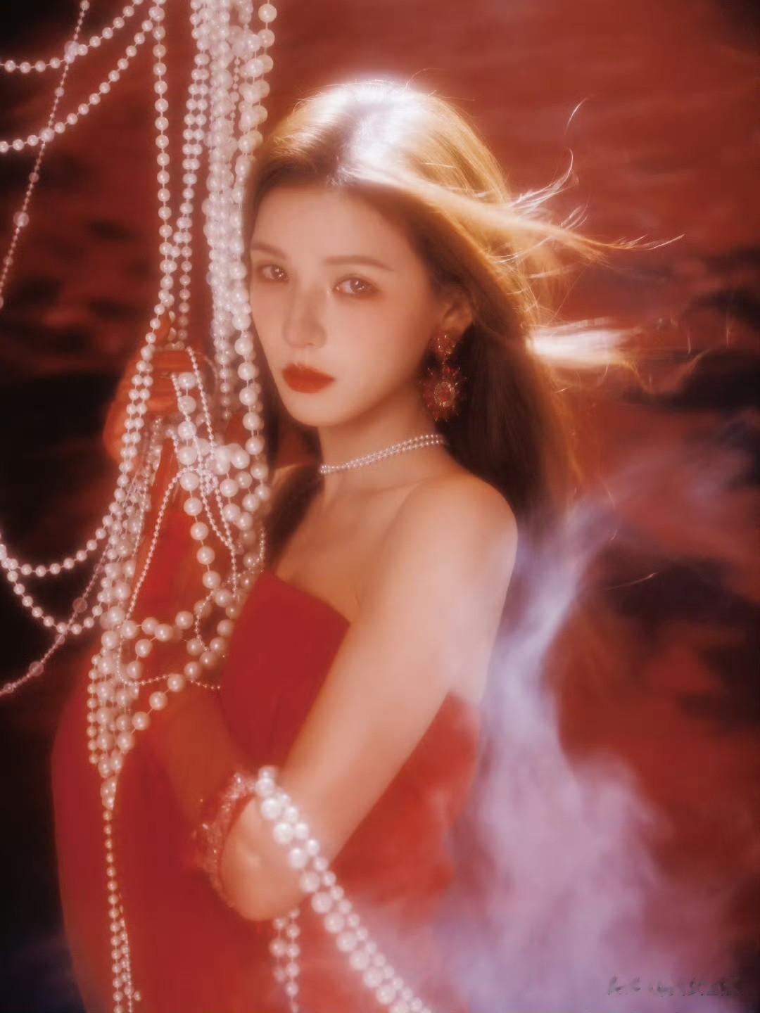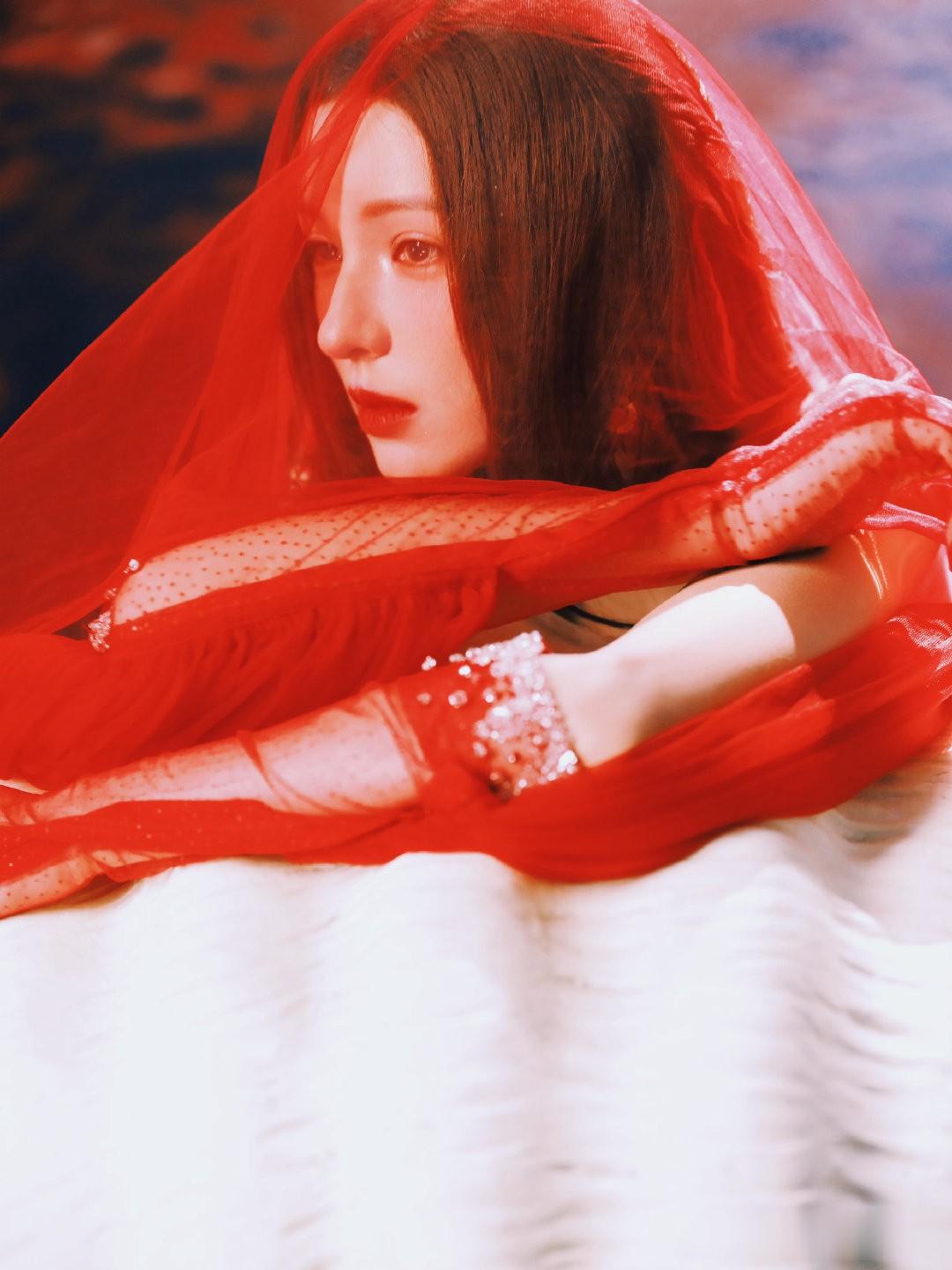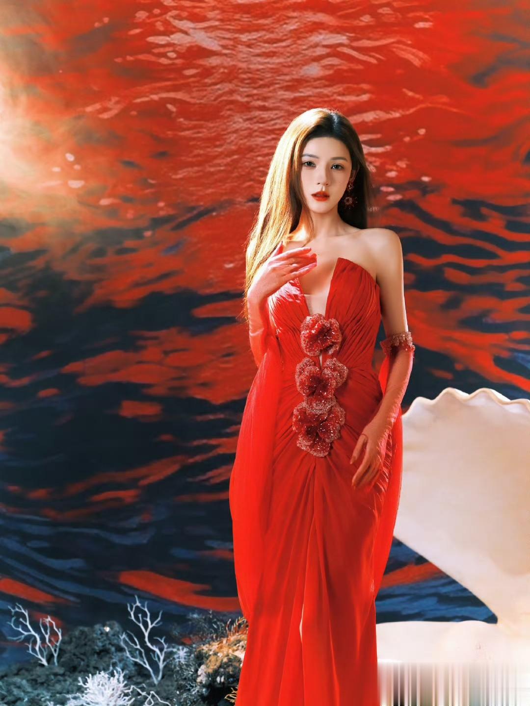 搭配同色系网纱手套与珍珠珠宝,复古优雅中透着灵动,酒红色大波浪卷发轻垂肩头,红唇点睛,眼神清冷又坚定,冷艳气场与热烈红裙碰撞出极致反差感,宛如从深海走来的珊瑚新娘,每一步都踩在审美点上。