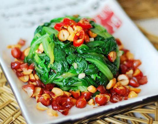 材料:小白菜200克、花生米30克、朝天椒一根、大蒜2瓣,盐2勺、鸡精少许、香油适量