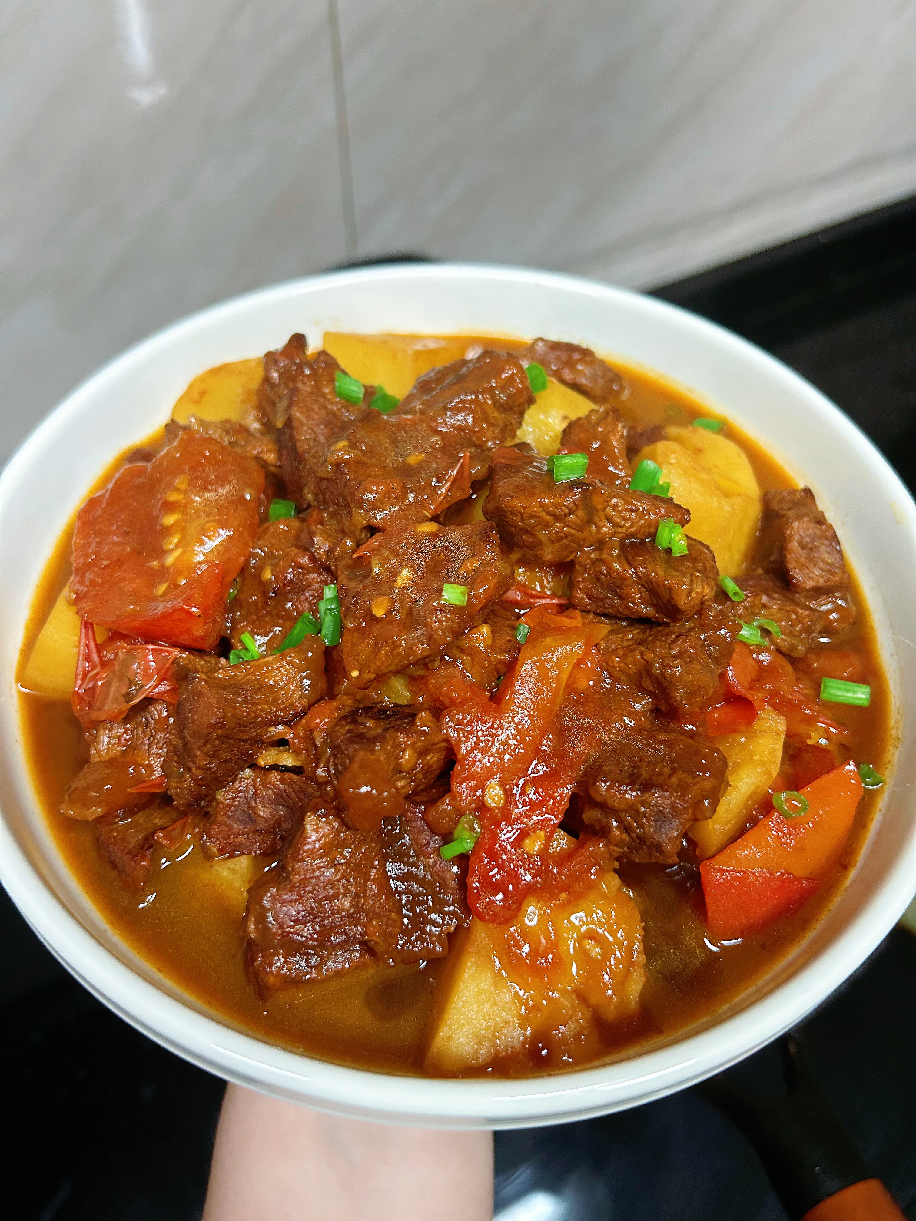 7. 出锅装盘:最后撒上葱花,一锅色香味俱全的番茄牛腩就完成了!