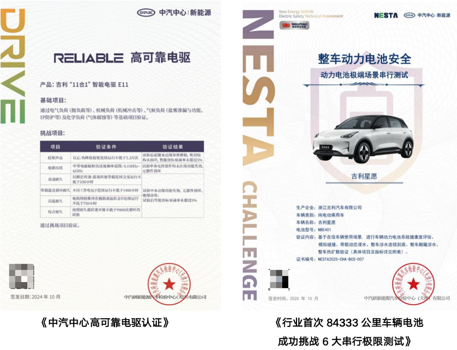 吉利星愿搭载行业首款11合1智能电驱,在功能高度集成的同时,还拥有同级领先的89.2%电驱效率,实现了同级最小的66L体积,将节省的空间以超大后备箱的形式还给了用户。通过了3000小时的台架耐久和200万公里的真实路试,星愿电驱完成了浸水工作、高温耐久、电磁抗扰、扭矩冲击、机械冲击等7大高难度挑战,获得了中汽研《高可靠电驱》的认证。