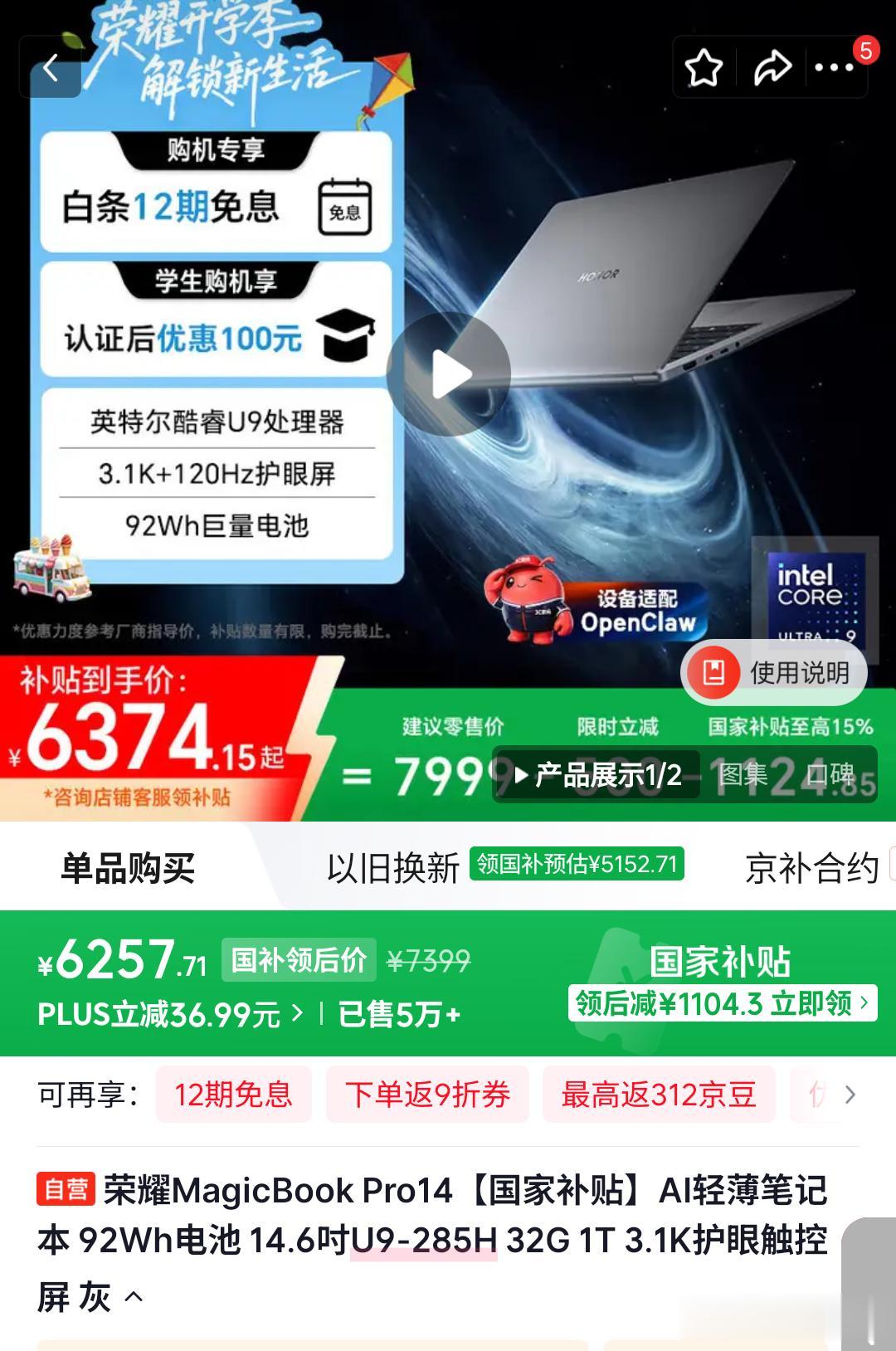 1.08千克重,也就是2.16斤重,14.95mm厚度,简单来说就是1.5cm。3.1K OLED的触摸屏,支持120Hz高刷和1600尼特峰值亮度,这块屏幕肯定不便宜。丝绒镁合金机身、搭载英特尔第三代Ultra处理器。从配置和价格来看,这个价格是偏高的,哪怕是苹果最新的MacBook Air13(M5)版本也才这个价格,要是老款M4的版本,加上国补五千多就能拿下,也比这个国补后的6799便宜不少。当然,可能有人会说,MacBook Air的生态和win不一样,没办法直接比较。