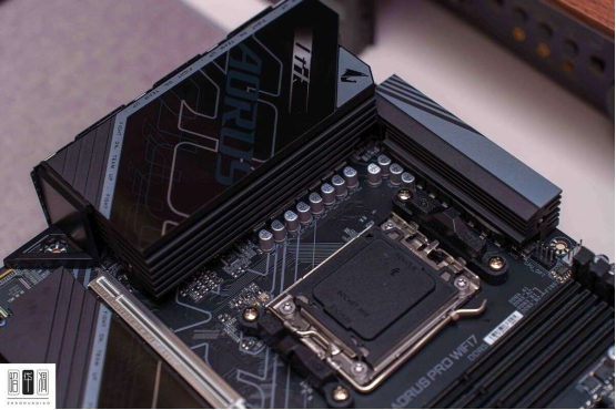 先从颜值和散热说起,毕竟现在装机谁不追求个 “视觉享受”?技嘉 B850M 电竞雕走的是简约电竞风,黑色 PCB 板打底,边缘点缀着低调的线条纹路,没有花里胡哨的多余设计,却很符合大多数玩家的审美。最让我惊喜的是它的散热配置 ——CPU 供电区域覆盖了一块超大尺寸的金属散热装甲,还内置了热管和高导热硅胶垫片,芯片组上也有独立散热片,这在千元级 M-ATX 主板里可不多见。