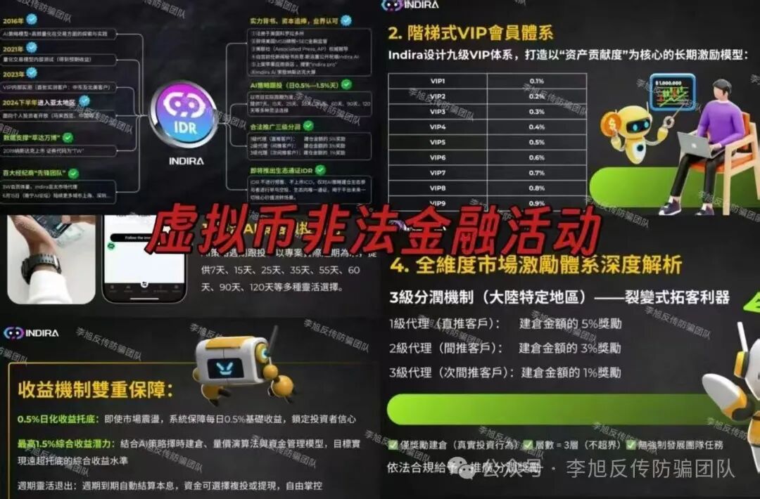 以“AI量化策略跟投”为噱头,虚构国际牌照、顶尖机构合作等背书,承诺0.5% - 1.5%日化超高收益,搭建九级VIP与三级分销体系,通过“拉人头、团队计酬”裂变,强制用USDT交易并规划发行IDR通证。