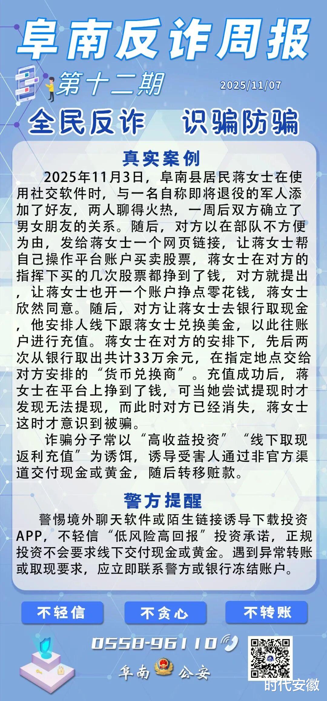 2025年11月3日,阜南县居民蒋女士在使用社交软件时,与一名自称即将退役的军人添加了好友,两人聊得火热,一周后双方确立了男女朋友的关系。随后,对方以在部队不方便为由,发给蒋女士一个网页链接,让蒋女士帮自己操作平台账户买卖股票,蒋女士在对方的指挥下买的几次股票都挣到了钱,对方就提出让蒋女士也开一个账户挣点零花钱,蒋女士欣然同意。随后,对方让蒋女士去银行取现金,他安排人线下跟蒋女士兑换美金,以此往账户进行充值。蒋女士在对方的安排下,先后两次从银行取出共计33万余元,在指定地点交给对方安排的“货币兑换商”。充值成功后,蒋女士在平台上挣到了钱,可当她尝试提现时才发现无法提现,而此时对方已经消失,蒋女士这时才意识到被骗。