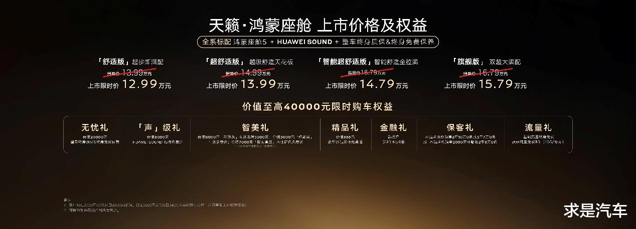 在购车权益方面,天籁·鸿蒙座舱还重磅推出终身双保政策,包括整车终身质保、终身免费保养,以及无忧礼、「声」级礼、智美礼、精品礼、金融礼、保客礼、流量礼共七大重磅福利,总价值至高4万元,致力于为用户带来从购车到用车的全周期优质体验。